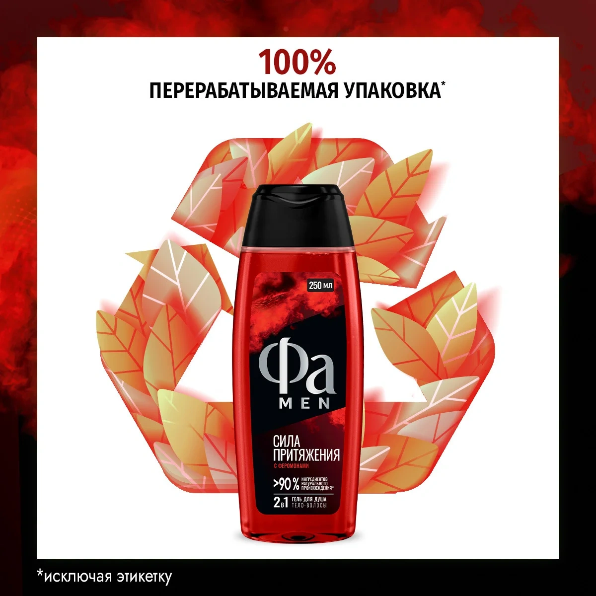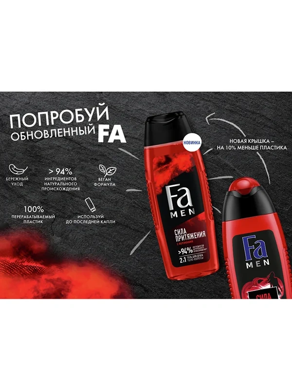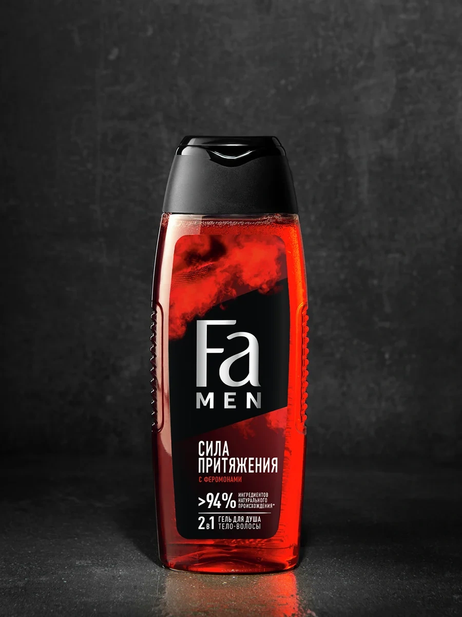 Подчеркните свою индивидуальность с Фа Men парфюмированным гелем для душа серии Сила Притяжения - продуктом, созданным специально для современных мужчин, которым важен стильный внешний вид и уверенность в себе. Этот универсальный гель для тела и волос объединяет в себе мощное очищающее действие и притягательный аромат бергамота и лайма, создающий ощущение свежести и энергии. Гель содержит феромоны, усиливающие ваш шарм и притягательность. Легкая текстура легко пенится и равномерно распределяется по коже и волосам, обеспечивая эффективное очищение. В составе более 90% натуральных ингредиентов, что делает этот гель безопасным и подходящим для ежедневного использования. Преимущества: - Универсальность: подходит как для тела, так и для волос. - Освежающее действие: устраняет усталость и придает силы. - Бережная формула: гель бережно относится к коже и волосам, не вызывая раздражений и сухости. Фа Гель для душа Сила Притяжения станет вашим надежным спутником в активном ритме жизни, помогая поддерживать чистоту и свежесть в течение всего дня. Особенности: - Подходит для всех типов кожи и волос. - Небольшой флакон - удобно брать в спорт-зал или поездку.