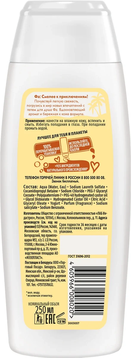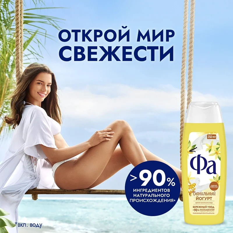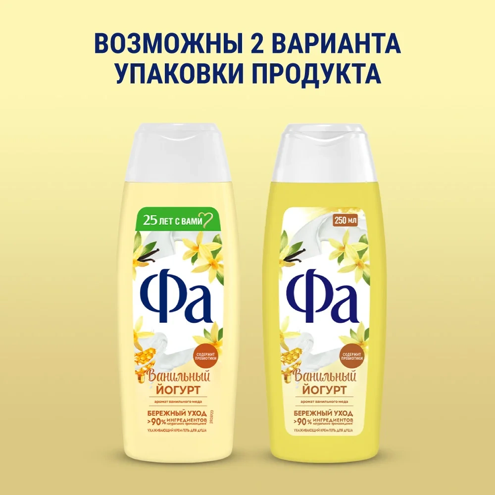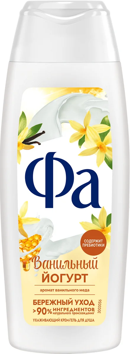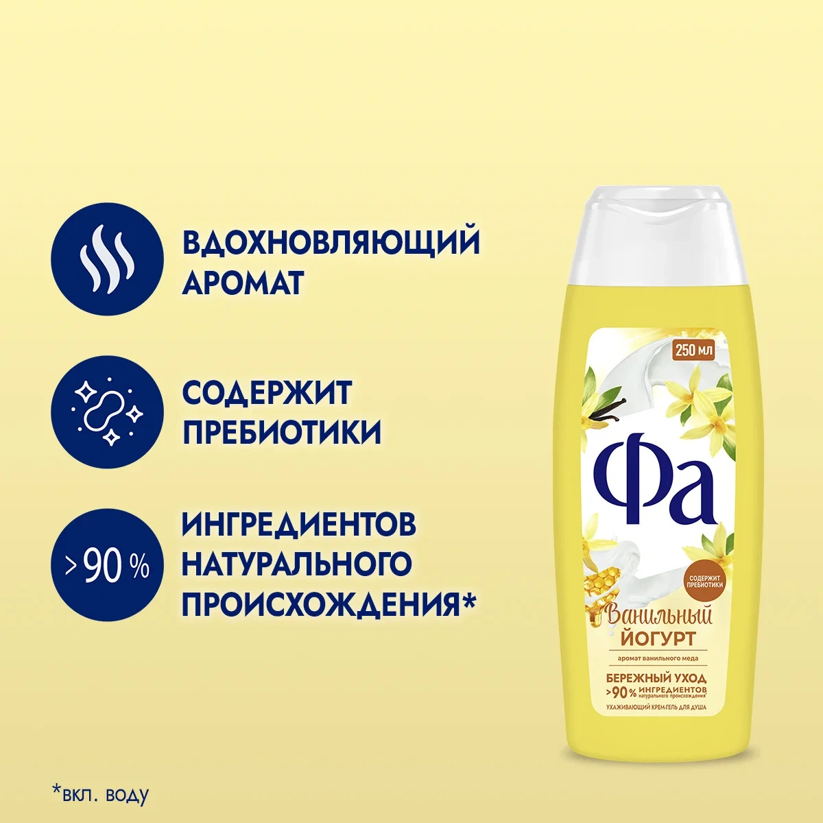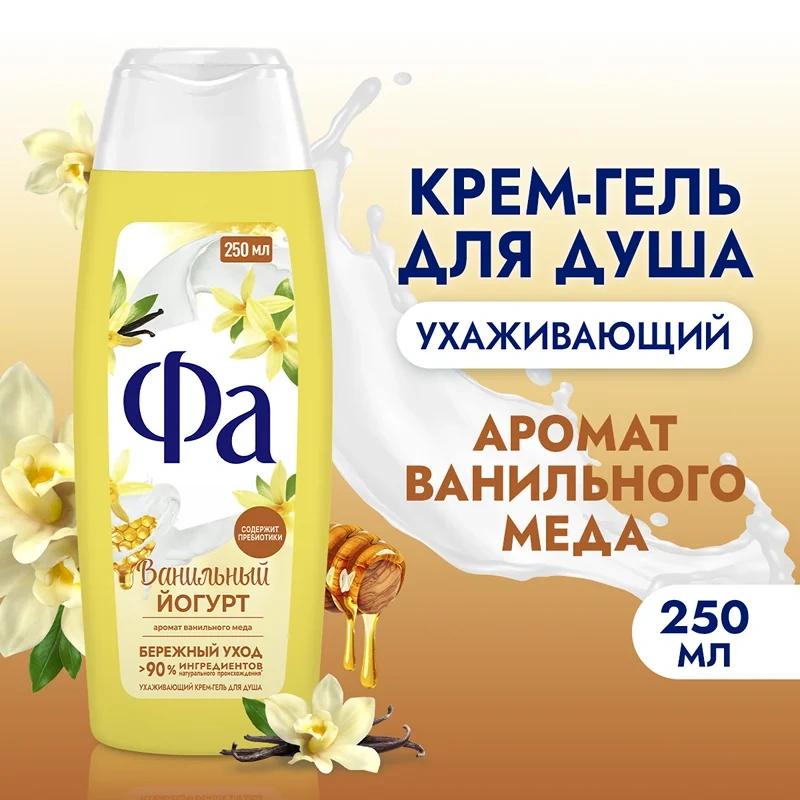 Побалуйте себя мягким уходом и нежным ароматом с Фа парфюмированным крем-гелем для душа серии Ванильный Йогурт - продуктом, созданным для женщин, которые ценят качественное очищение и приятные парфюмерные композиции. Этот гель сочетает в себе насыщенную кремовую текстуру и аппетитный аромат ванильного мёда, превращая обычный душ в настоящий ритуал удовольствия. Крем-гель бережно очищает кожу, одновременно увлажняя и питая её. Содержащиеся в нём пребиотики способствуют поддержанию здорового баланса микрофлоры, обеспечивая коже дополнительную защиту и уход. Более 90% ингредиентов имеют натуральное происхождение, что делает этот гель безопасным и эффективным для ежедневного использования. Преимущества: - Бережный уход: гель обеспечивает глубокое увлажнение и питание кожи, делая её мягкой и гладкой. - Парфюмерная композиция: теплый аромат ванили и мёда наполняет ванную комнату приятными сладкими нотками. - Кремовая текстура: облегчает нанесение и равномерное распределение геля по телу. Фа Крем-гель для душа Ванильный Йогурт станет вашим верным спутником в ежедневных ритуалах красоты, обеспечивая коже комфорт и заботу на протяжении всего дня. Особенности: - Подходит для всех типов кожи. - Обеспечивает длительное ощущение свежести и мягкости кожи. - Небольшой флакон - удобно брать в спорт-зал или поездку. Попробуйте Фа Гель для душа Ванильный йогурт и подарите своей коже заботу!