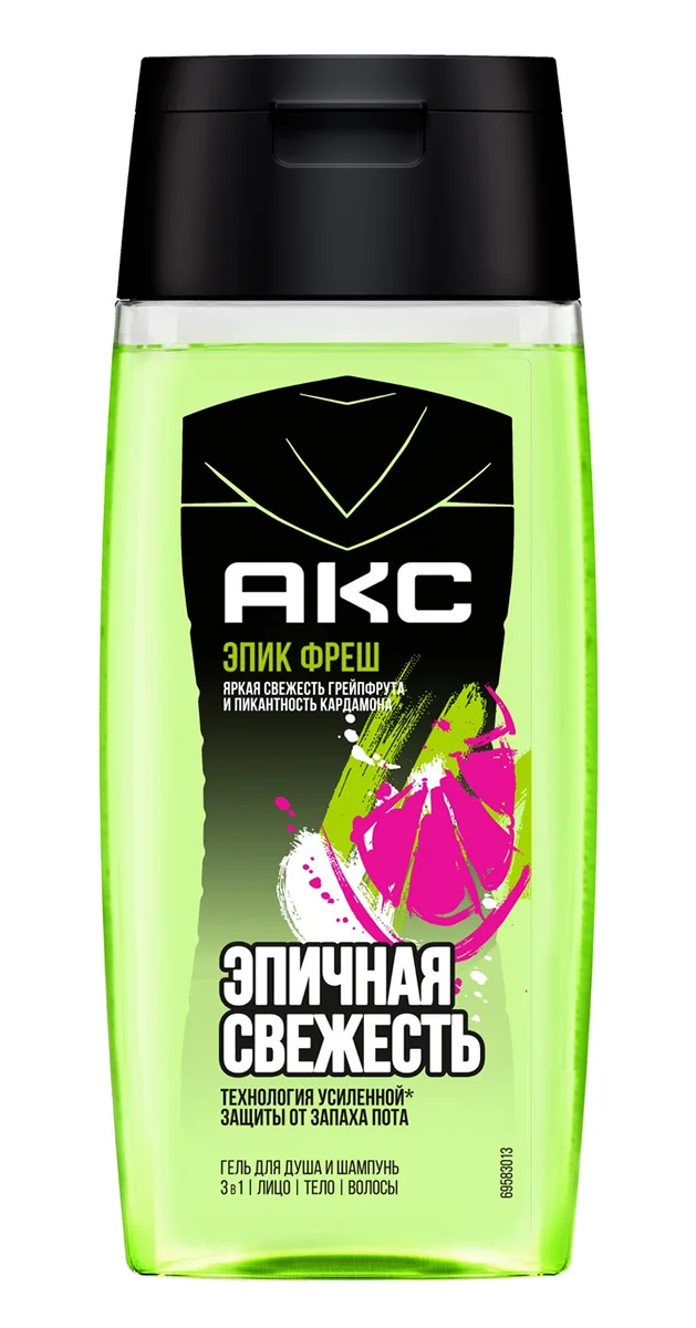 Встречай крутую новинку от Акс - средство для личной гигиены ЭПИК ФРЕШ. Продукт 3 в 1 одинаково хорош как шампунь для волос, средство для умывания лица и гель для душа. Компактный размер позволяет его брать с собой куда угодно. Шампунь 3 в 1 мужской – это настоящая эпичная свежесть! Гель для душа мужской имеет невероятно притягательный фужерный аромат с аккордами грейпфрута и нотками кардамона. Мужской шампунь содержит пребиотики растительного происхождения и увлажняющие ингредиенты. Отмечены в составе - пребиотики способствуют поддержанию благоприятной среды для размножения полезной микрофлоры на поверхности кожи. Полезная микрофлора помогает подавлять размножение бактерий, образующих неприятный запах. Не является лекарственным средством. Принадлежит мужской линейке косметических продуктов по уходу за кожей, может использоваться как шампунь для волос, мыло для лица и средство для мытья всего тела. Нежная консистенция отлично пенится, экономно расходуется, равномерно распределяется на поверхности кожного покрова, тщательно и бережно удаляет ороговевший слой клеток, пыль, жирность и другие загрязнения, быстро смывается полностью, оставляет кожу гладкой, чистой и свежей надолго. Гель дарит бодрящий аромат с цитрусовыми нотами грейпфрута и деликатным пряным акцентом кардамона. За счёт комплекса увлажняющих компонентов и защиты от пота, он надолго насыщает кожу влагой, предотвращает неприятный запах и чрезмерное потоотделение, заряжает энергией. Состав не содержит парабенов, одобрен дерматологами.