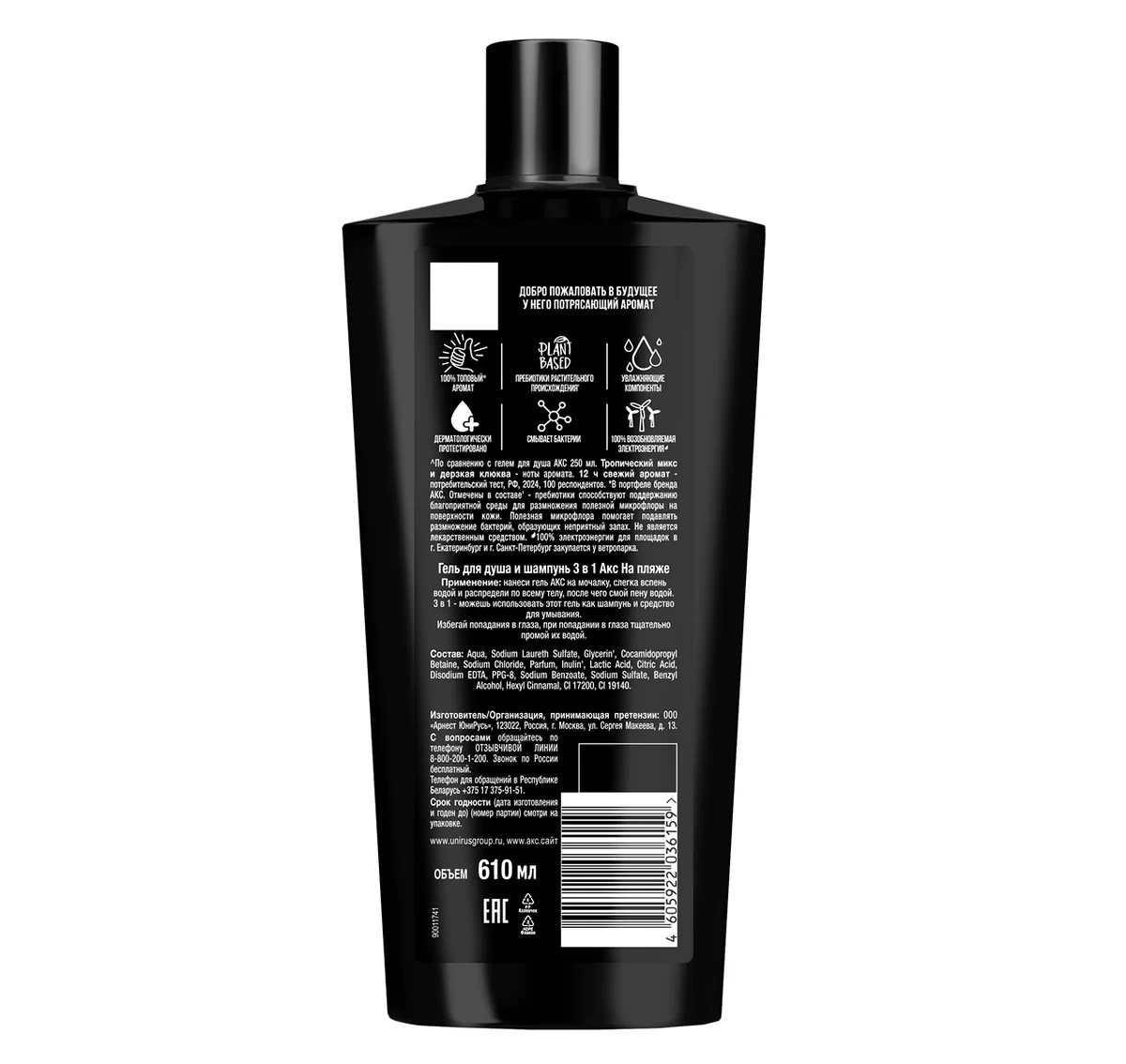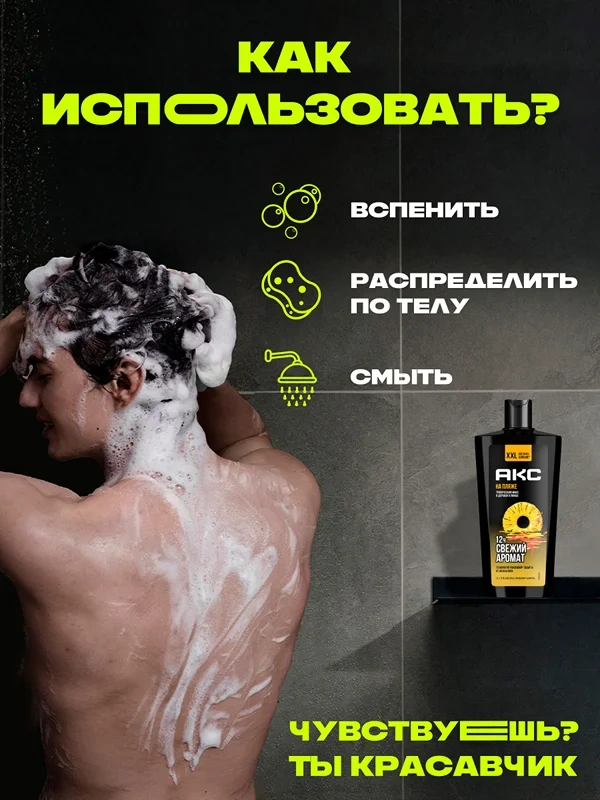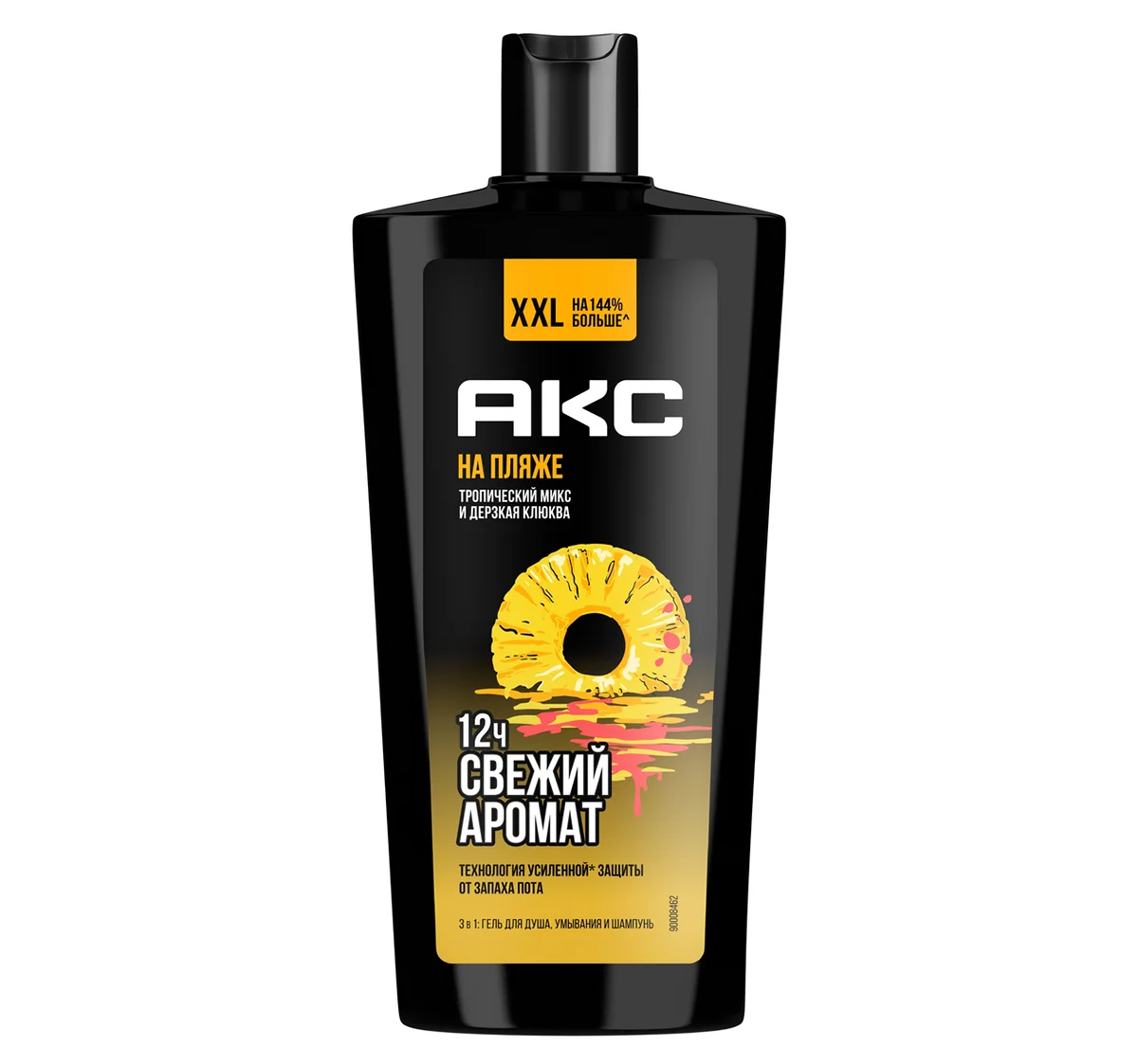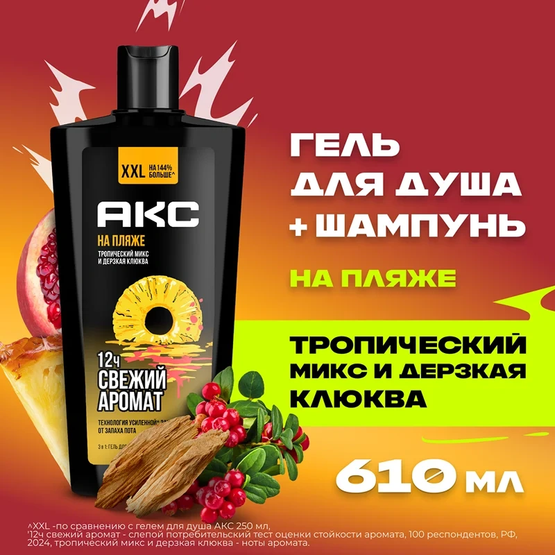Встречай крутую новинку от Акс - средство для личной гигиены На пляже с топовым* ароматом. Продукт 3в1 одинаково хорош как шампунь для волос, средство для умывания лица и гель для душа. Мужской шампунь 3в1 имеет яркий фруктовый аромат, на создание которого нас вдохновил известный хит - популярный тропический коктейль. Притягательные ноты клюквы, сочного ананаса и яркого апельсина передали новому аромату Акс свой страстный характер. Гель для душа мужской разработан на основе технологии усиленной защиты от запаха пота на протяжении 12 часов. Объем 610мл XXL на 144% больше, а значит, вам его хватит надолго.