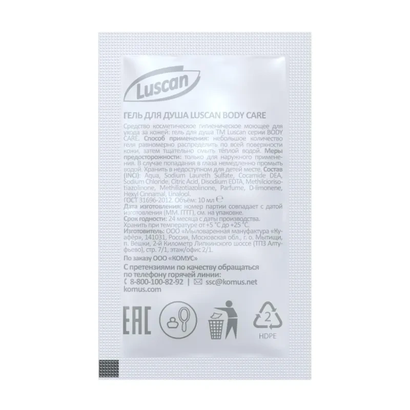 Гель для душа Luscan Body care 10 мл саше (500 штук в упаковке). Гель для душа Luscan деликатно очищает кожу, надолго даря ощущения чистоты и свежести. Способ применения: небольшое количество геля равномерно распределить по всей поверхности кожи, затем тщательно смыть теплой водой. Меры предосторожности: только для наружного применения. В случае попадания в глаза немедленно промыть водой. Хранить в недоступном для детей месте. Состав: Aqua, Sodium Laureth Sulfate, Cocamide DEA, Sodium Chloride, Сitric Acid, Disodium EDTA, Methilciorisotiazolinone, Methilizotiazolinone, Parfume, D-limonene, Hexyl Cinnamal, Linalool. Хранить при температуре от +5 С до +25 С. Срок годности: 24 месяца с даты производства. Товары под маркой "Luscan" разработаны для профессионального использования в сегменте В2В для поддержания чистоты, уюта и комфорта вашего бизнеса с гарантией качества и рыночной цены. Все товары произведены под контролем "Комус".