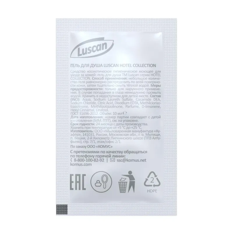 Гель для душа Luscan Hotel collection 10 мл саше (500 штук в упаковке). Гель для душа Luscan деликатно очищает кожу, надолго даря ощущения чистоты и свежести. Способ применения: небольшое количество геля равномерно распределить по всей поверхности кожи, затем тщательно смыть теплой водой. Меры предосторожности: только для наружного применения. В случае попадания в глаза немедленно промыть водой. Хранить в недоступном для детей месте. Состав: Aqua, Sodium Laureth Sulfate, Cocamide DEA, Sodium Chloride, Сitric Acid, Disodium EDTA, Methilciorisotiazolinone, Methilizotiazolinone, Parfume, D-limonene, Hexyl Cinnamal, Linalool. Хранить при температуре от +5 С до +25 С. Срок годности: 24 месяца с даты производства. Товары под маркой "Luscan" разработаны для профессионального использования в сегменте В2В для поддержания чистоты, уюта и комфорта вашего бизнеса с гарантией качества и рыночной цены. Все товары произведены под контролем "Комус".