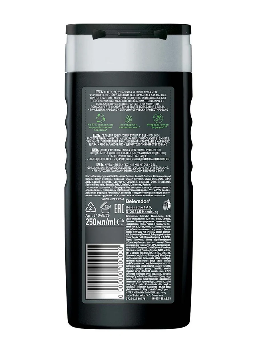 Когда обычного очищения недостаточно, на помощь приходит гель для душа Nivea Men Сила угля. Его ухаживающая формула с натуральным древесным углем удаляет грязь, жир и пот, работая как магнит: притягивает загрязнения, тщательно очищает кожу, не оставляя ощущения сухости. Мужественный стойкий аромат тонизирует и освежает, и остается свежестью на коже до 8 часов. Испытай очищающую силу угля, ощути экстраочищение! Подходит для ежедневного применения. Nivea Men заботится о разных потребностях кожи, учитывая их типы и твой образ жизни. Выбери свой гель для душа в линейке средств Nivea Men или попробуй их все! Забота о коже каждый день! Применение: нанесите на тело, помассируйте и смойте теплой водой.