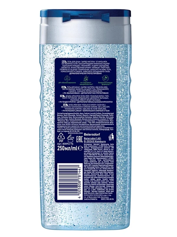 Хотите произвести впечатление? Сделайте это с чистой свежестью от Nivea Men.Гель для душа Заряд Чистоты с инновационной формулой массирующих микрочастиц скраба придает вашей коже настоящий заряд чистоты - бережно увлажняет и очищает. Подходит для всех типов кожи, включая жирную и проблемную. Не сушит кожу, хорошо пенится и легко смывается. Имеет свежий мужской аромат. Подходит для ежедневного применения, имеет нейтральный pH. Освежающий и бодрящий, этот гель - идеальный помощник на каждый день. Просто нанесите гель для душа на влажную кожу, массажными движениями вспеньте и помассируйте, а затем тщательно смойте. Избегайте попадания в глаза. Дерматологически протестирован.