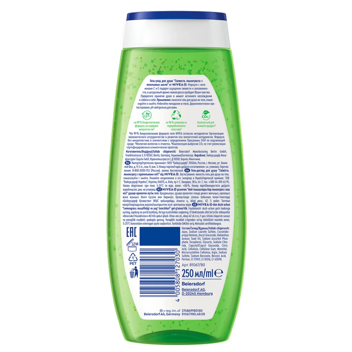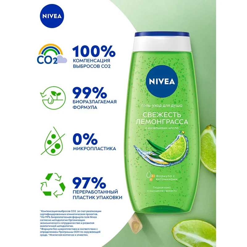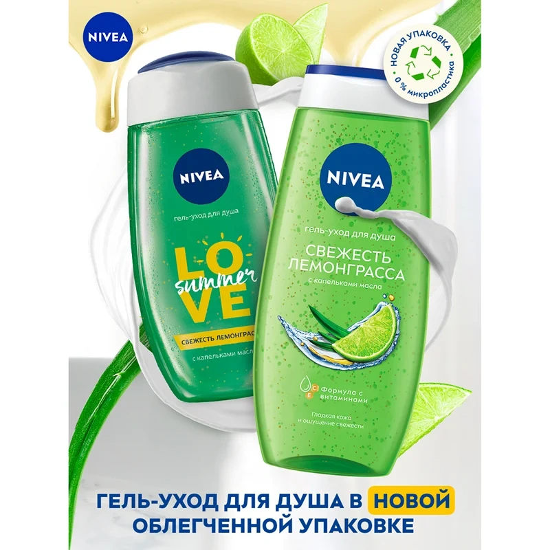 Откройте для себя ощущение невероятной свежести с гель-уходом для душа Nivea Свежесть лемонграсса. Лёгкий аромат лемонграсса пробуждает чувства, а шелковистая пена освежающего геля с ценными масляными гранулами и экстрактом лемонграсса заботится о Вашей коже - для интенсивного ухода и неповторимого ощущения свежести. Превратите ежедневное принятие душа в момент истинного наслаждения. Сбалансированный pH предотвращает пересушивание кожи, поддерживая ее естественный уровень увлажненности. Обновленная биоразлагаемая упаковка из переработанного пластика, потому что мы заботимся не только о красоте и здоровье кожи, но и об окружающей среде! Мы хотим менять мир к лучшему и ставим перед собой амбициозные цели в сфере защиты окружающей среды. Исследователи Nivea постоянно совершенствуют формулы и материалы упаковок, чтобы сделать наши средства максимально подходящими для кожи, одновременно минимизируя уровень их воздействия на природу.