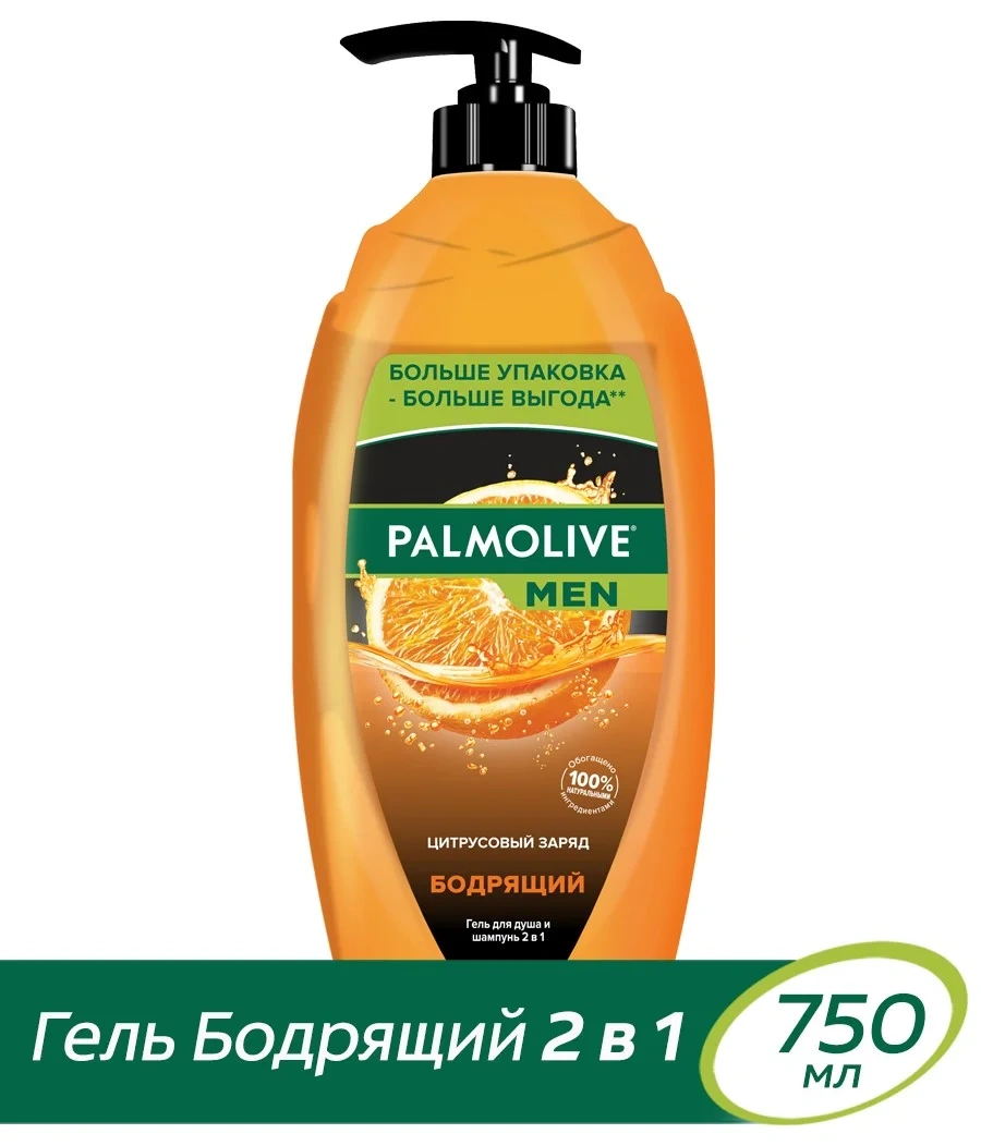 Гель для душа Palmolive Men Бодрящий Цитрусовый Заряд 2 в 1 для тела и волос, 750мл