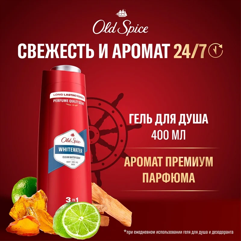 Многие считают, что вода — самый мощный элемент на Земле. Считают-то, конечно, многие, но все они неправы: во-первых, вода не является элементом, а во-вторых, уран-235 совершенно точно мощнее. Но то, что Old Spice (Олд Спайс) Whitewater обладает наисвежайшим ароматом – научно доказанный факт, ведь миллионы крутых парней во всем мире испытывают его на прочность каждый день. Гель для душа+шампунь 3в1 Old Spice Whitewater – это тот самый секретный компонент эликсира мужественности! Попробуй его уже сегодня и убедись, что динамичный аромат с яркими нотами лимона не только защитит тебя от неприятного запаха на весь день, но и выкрутит на максималки твою уверенность в себе. Кстати, XL упаковка геля для душа Old Spice Whitewater, которой хватит надоооооолго, вмещает целых 400 мл мужичайшей свежести! Хочешь ощущать дичайшую энергию Old Spice 24/7? Используй мужской гель для душа+шампунь 3в1 Old Spice Whitewater, а затем возьми дезодорант из этой же коллекции, чтобы прокачать свой день! Преимущества: - Гель для душа+шампунь 3в1 - для тех, у кого есть тело, волосы и лицо; - До 40 дней свежести; - Грязь и запах смывает, мужичайший аромат и свежесть оставляет; - Динамичный яркий аромат, который будет с тобой весь день.