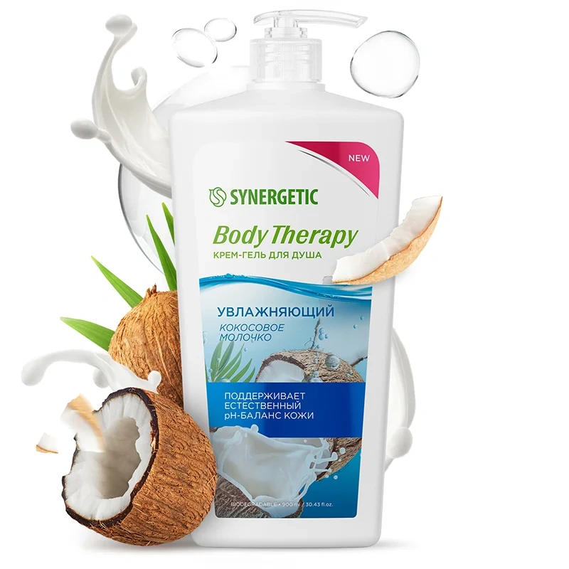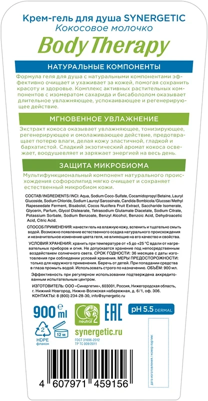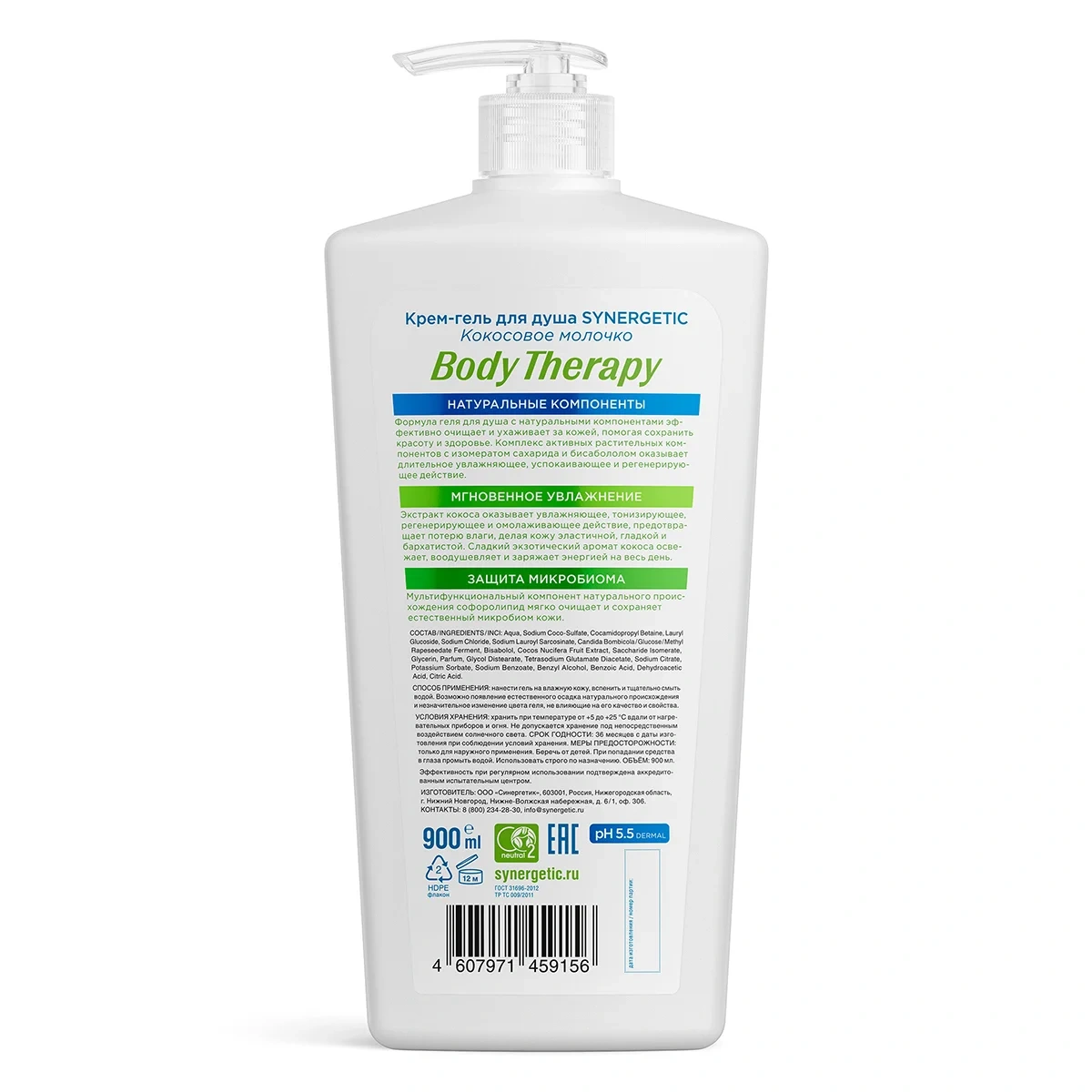 Гель для душа Synergetic Body Therapy Кокосовое молочко, 900мл - это деликатное и эффективное средство для очищения кожи. Формула геля для душа с натуральными компонентами эффективно очищает и ухаживает за кожей, помогая сохранить красоту и здоровье. Комплекс активных растительных компонентов с изомератом сахарида и бисабололом оказывает длительное увлажняющее, успокаивающее и регенерирующее действие. Экстракт кокоса оказывает увлажняющее, тонизирующее, регенерирующее и омолаживающее действие, предотвращает потерю влаги, делая кожу эластичной, гладкой и бархатистой. Сладкий экзотический аромат кокоса освежает, воодушевляет и заряжает энергией на весь день. Мультифункциональный компонент натурального происхождения софоролипид мягко очищает и сохраняет естественный микробиом кожи. Физиологичный уровень pH 5,5 способствует устранению сухости и гарантирует безопасность при частом использовании средства даже для чувствительной кожи. Эффективность при регулярном использовании подтверждена аккредитованным испытательным центром.