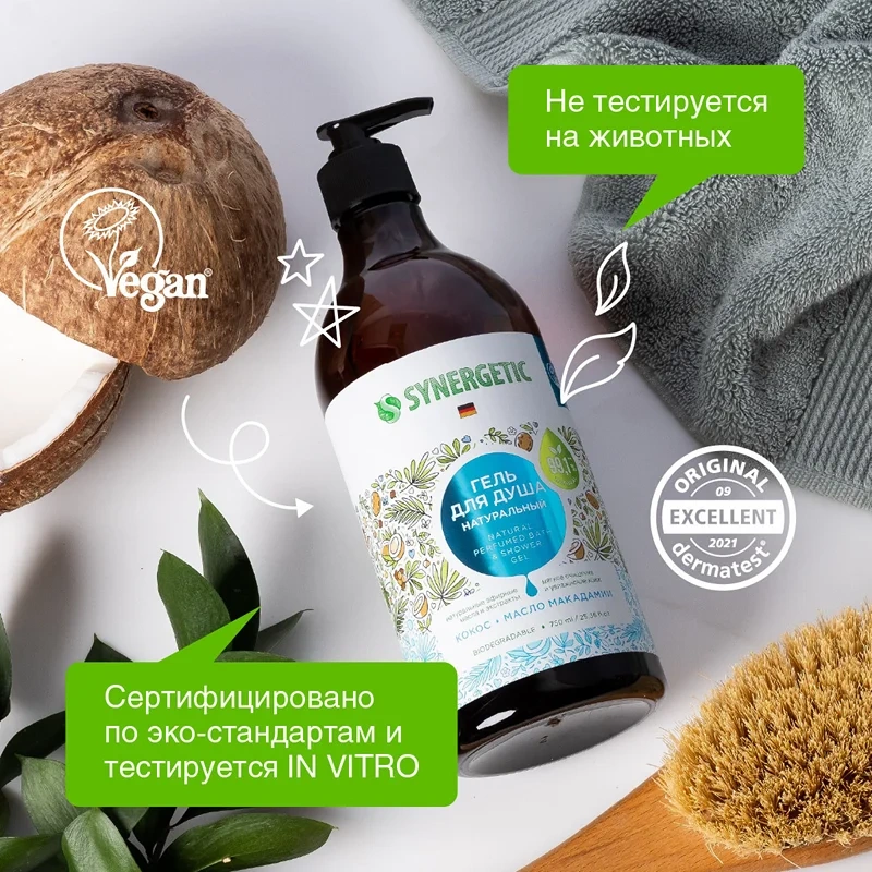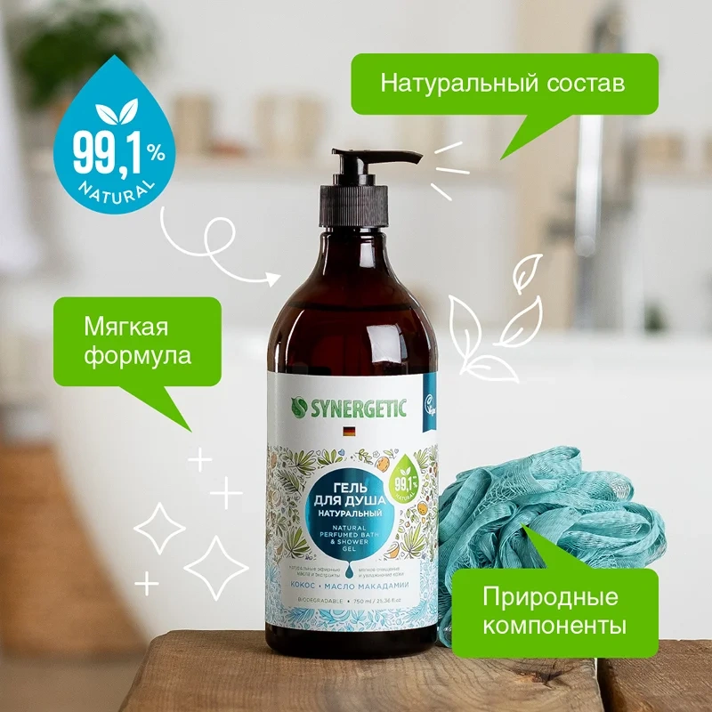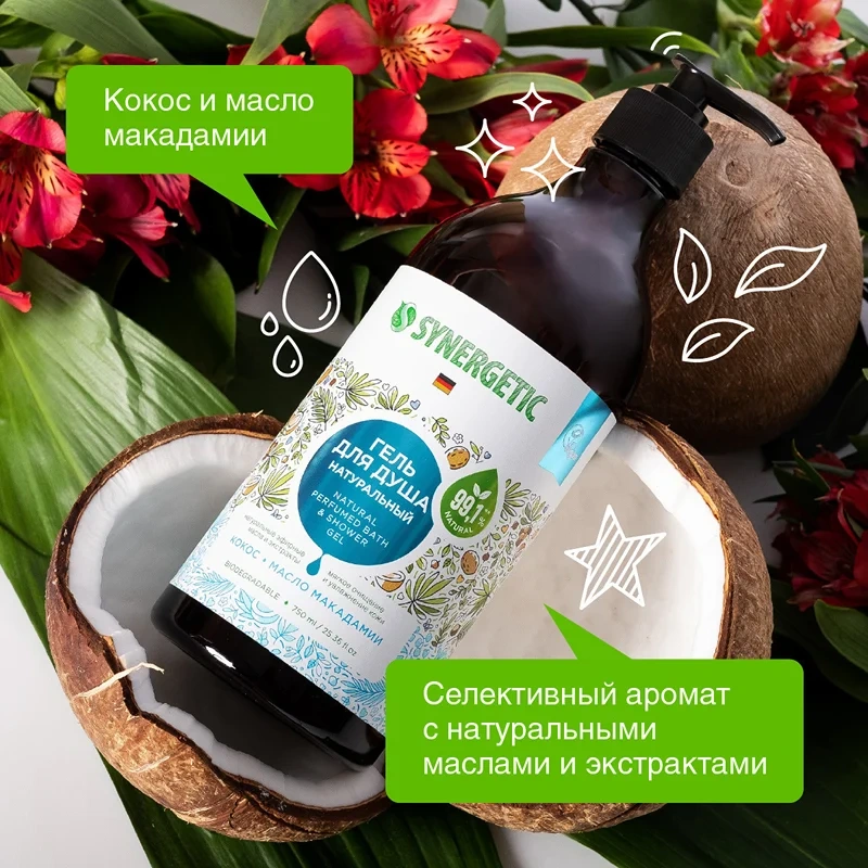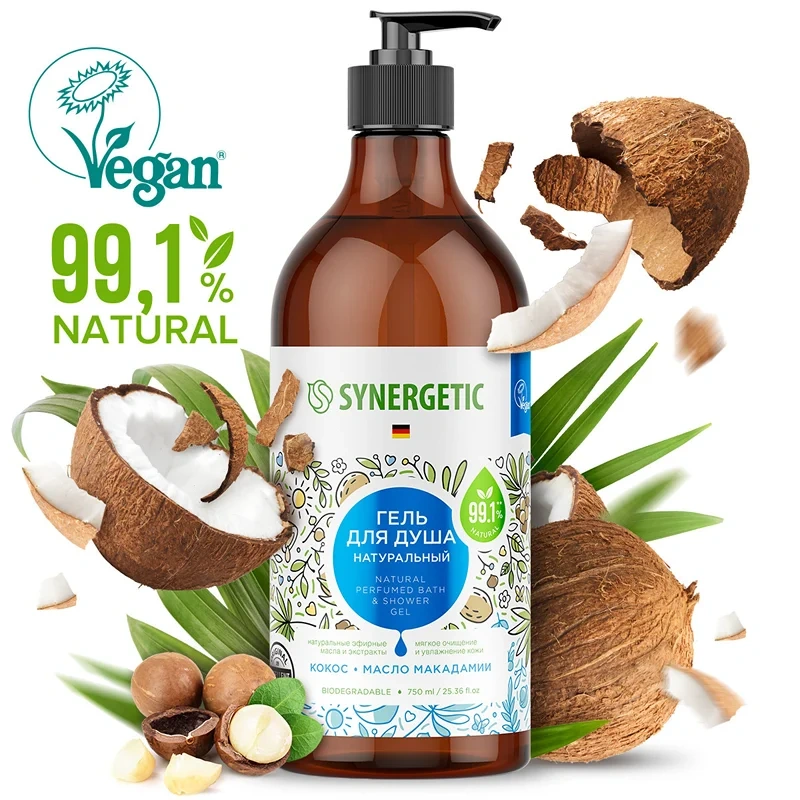 Натуральный биоразлагаемый гель для душа Synergetic Кокос и масло макадамии — это деликатное средство для очищения кожи, на 99,1% состоящее из натуральных компонентов. Гипоаллергенный аромат геля Synergetic Кокос и масло макадамии разработан в швейцарском доме Givaudan с нотами макадамии и кокоса. Натуральное кокосовое масло питает и ускоряет регенерацию кожи, придавая мягкость и эластичность, а масло макадамии ухаживает за чувствительной кожей. Софоролипид из рапсового масла мягко очищает и сохраняет естественный микробиом кожи.