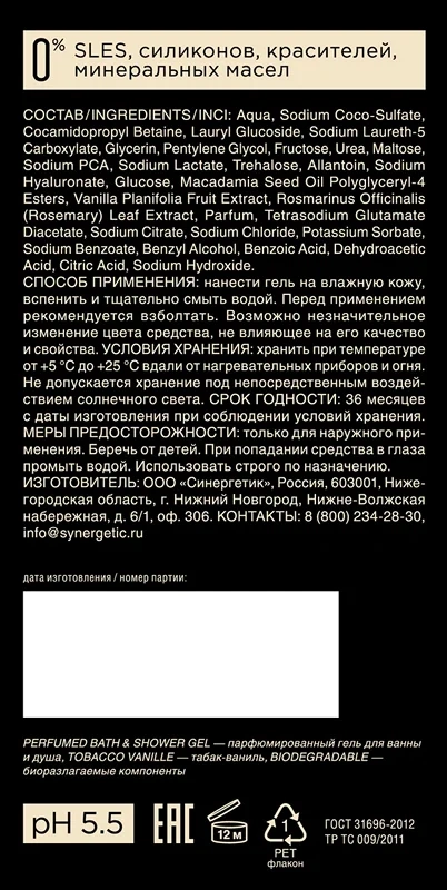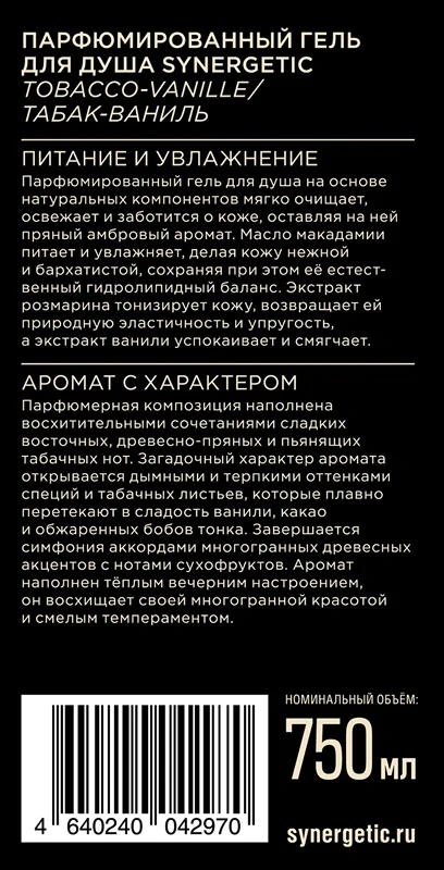 Парфюмированный гель для душа Synergetic tobacco-vanille табак-ваниль на основе натуральных компонентов мягко очищает, освежает и заботится о коже, оставляя на ней пряный амбровый аромат. Масло макадамии питает и увлажняет, делая кожу нежной и бархатистой, сохраняя при этом её естественный гидролипидный баланс. Экстракт розмарина тонизирует кожу, возвращает ей природную эластичность и упругость, а экстракт ванили успокаивает и смягчает. Физиологичный уровень pH 5,5 гарантирует мягкость кожи и безопасность при частом использовании даже для чувствительной кожи. Средство не содержит SLES, силиконов, красителей и минеральных масел. Парфюмерная композиция наполнена восхитительными сочетаниями сладких восточных, древесно-пряных и пьянящих табачных нот. Загадочный характер аромата открывается дымными и терпкими оттенками специй и табачных листьев, которые плавно перетекают в сладость ванили, какао и обжаренных бобов тонка. Завершается симфония аккордами многогранных древесных акцентов с нотами сухофруктов.