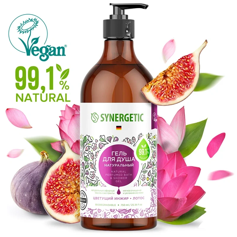 Натуральный биоразлагаемый гель для душа Synergetic Цветущий инжир и лотос — это деликатное средство для очищения кожи, на 99,1% состоящее из натуральных компонентов. Гипоаллергенный аромат геля Synergetic Цветущий инжир и лотос разработан в швейцарском доме Givaudan с использованием натуральных эфирных масел померанца, элеми, эвкалипта, лайма и мирта. Масла бабассу и сладкого миндаля, экстракты инжира и цветков лотоса оказывают регенерирующее действие, питают и увлажняют сухую кожу, делая её гладкой и бархатистой.