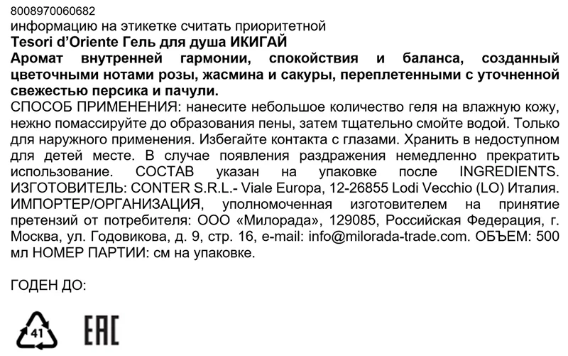 Итальянские мастера парфюмеры создали новинку Икигай - парфюмированный гель для душа - уютный, сладкий, томный, невероятно стойкий, с изысканным дуэтом цветов, фруктов и ветивера, оттенённый кремовыми нотами в шлейфе. Аромат открывается нежным цветочным букетом, который напоминает о свежести и чистоте только что распустившейся вишни, переходя в чувственный древесно-амбровый аккорд, окутывающий кожу мягкими и неосязаемыми объятиями. Этот аромат обогащен смесью эфирных масел, которые помогут вам ощутить умиротворение и расслабление, что доказано нейробиологическими тестами. В составе впервые использована рисовая вода. Её применяли в качестве косметического средства в древней Японии, чтобы сохранить свою кожу мягкой и гладкой. Tesori d'Oriente создает ритуал благополучия, гармонии через ароматы. Гель для душа подарочный создаёт шарм восточной роскоши. 5 натуральных масел ухаживают за кожей, итальянское производство, формулы без парабенов, силиконов и синтетических красителей - это всё атрибуты высокого ценового сегмента.