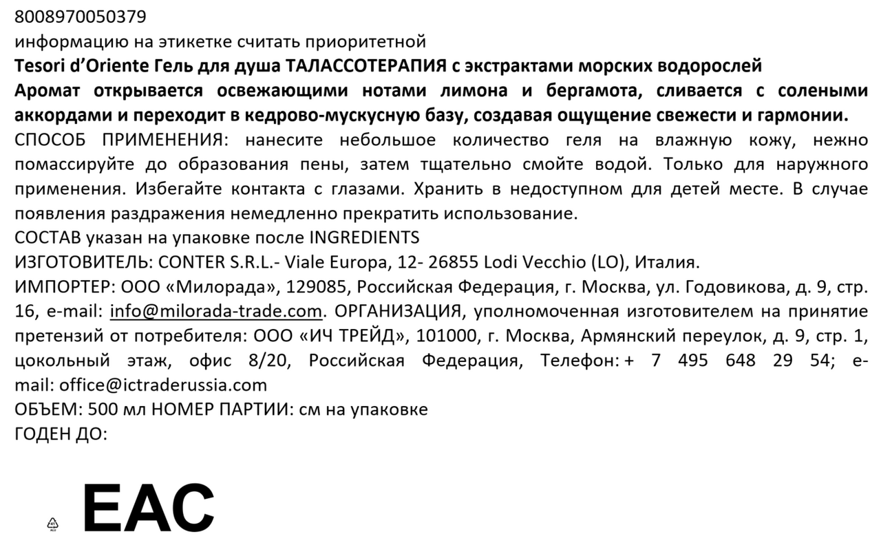 Гель для душа Tesori D'Oriente Талассотерапия, 500мл