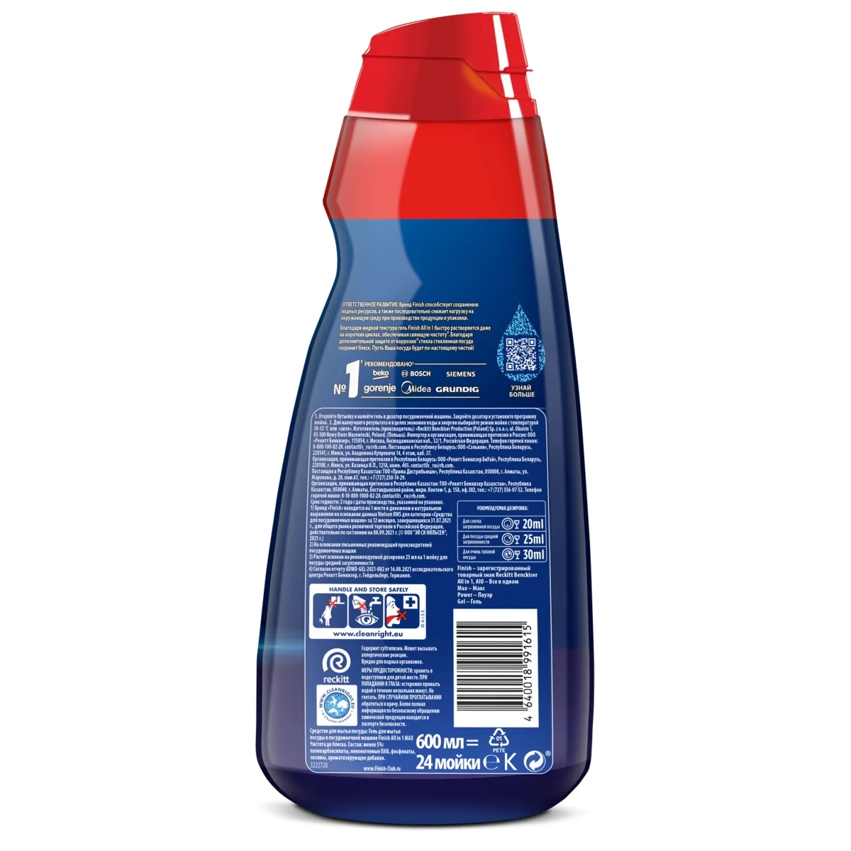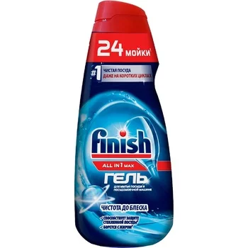 Гель для посудомоечных машин Finish Max Чистота до блеска All in 1 600 мл Назначение: гель для посудомоечных машин Finish Max Чистота до блеска All in 1 это: — Чистая посуда даже на коротких циклах. — Борется со сложными загрязнениями: застывший жир, белковые пятна, кофе — Способствует защите стеклянной посуды от коррозии. — Удобно дозировать в зависимости от количества посуды и степени ее загрязненности. — Хватает на 20–30 моек в зависимости от дозировки. Способ применения: — Откройте бутылку и налейте гель в дозатор посудомоечной машины. — Дозируйте гель в зависимости от количества посуды и степени ее загрязненности: 20 мл — для слегка загрязненной посуды; 25 мл — для посуды средней загрязненности; 30 мл — для очень грязной посуды. — Закройте дозатор установите программу мойки. Меры предосторожности: хранить в местах, недоступных для детей. Не допускать попадания в глаза. В случае попадания в глаза тщательно промойте водой. Не глотать. При попадании в полость рта обратитесь к врачу. Содержит субтилизин. Может вызвать аллергическую реакцию. Гель Finish All in 1 Max не защищает посуду от механических повреждений и не может восстанавливать поврежденную посуду. Состав: менее 5: поликарбоксилаты, неиогенные ПАВ, фосфонаты, энзимы, ароматизатор. Условия хранения: хранить в местах, недоступных для детей. Срок годности: 2 года.