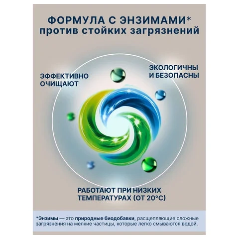 Жидкий гель-концентрат – максимальная эффективность в бережном режиме стирки. Моментально растворяется и работает при низких температурах. Отстирывает более 100 видов пятен, в том числе от шоколада, ягод, кофе, красного вина, косметики, сажи, грязи. Дарит вещам мягкость, стойкий аромат свежести. Концентрат-формула эффективна при сниженной дозировке. Рекомендован для автоматической и ручной стирки хлопчатобумажных и синтетических изделий из светлых и окрашенных тканей.