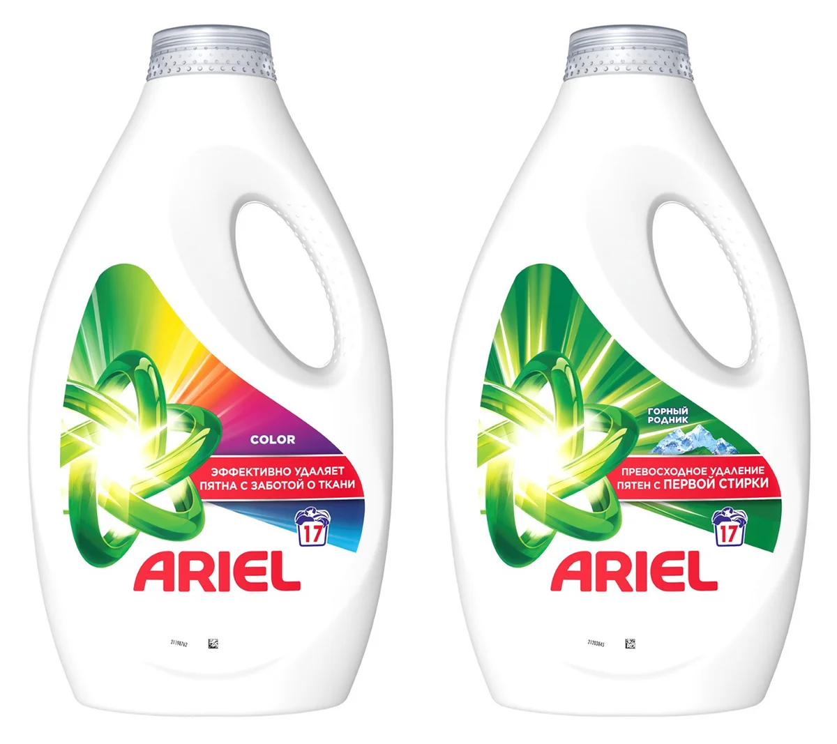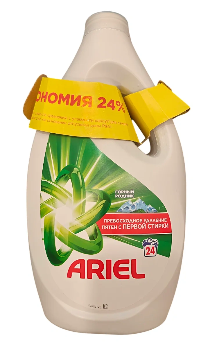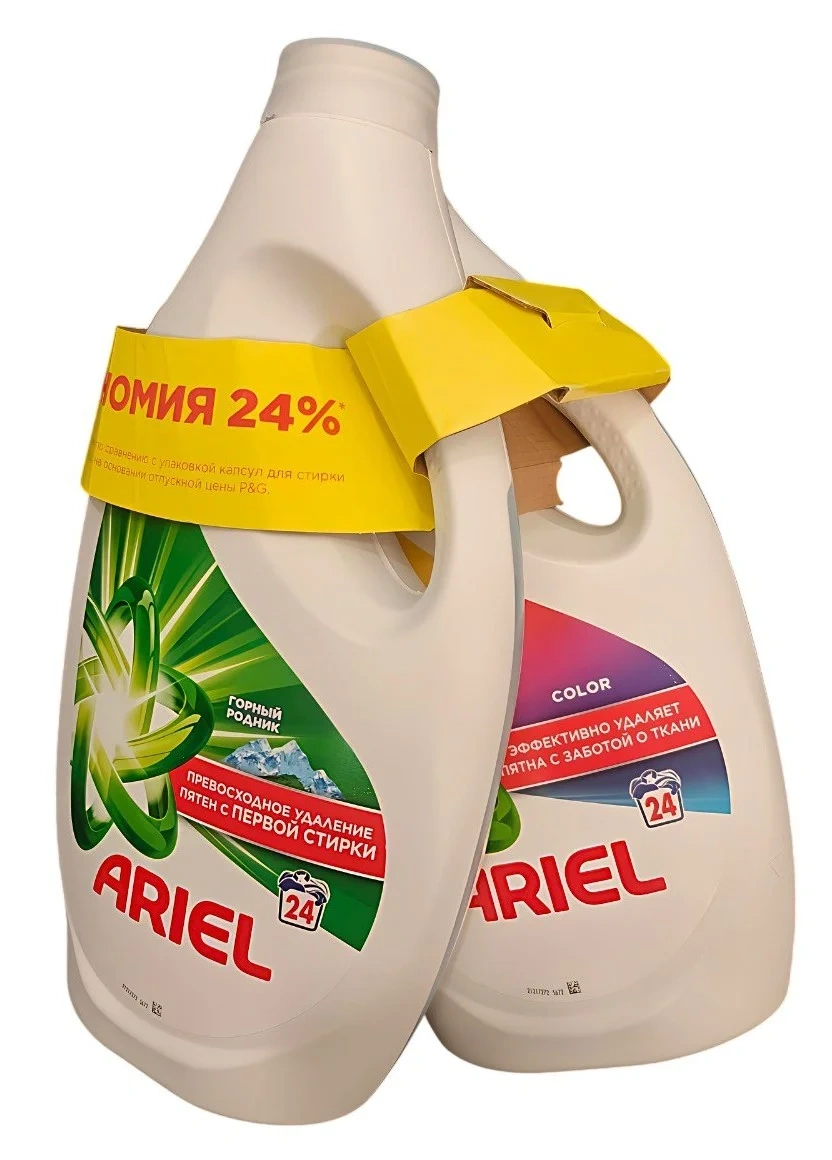 Набор включает гель для стирки Ariel Горный родник 1156 мл и Колор 1156 мл. Предназначен для стирки цветного и белого белья. Жидкий порошок Ariel эффективно и бережно удаляет загрязнения, сохраняя белизну и свежесть одежды и белья. В отличие от обычных порошков, гель для стирки сразу попадает в барабан стиральной машины и быстро растворяется в воде. Он подходит для коротких циклов стирки и удаляет пятна и грязь, вызывающие неприятные запахи, придавая одежде сияющую чистоту и приятный аромат свежести.
