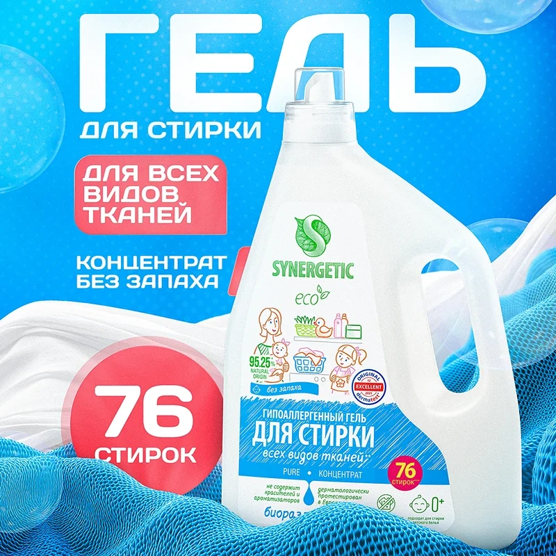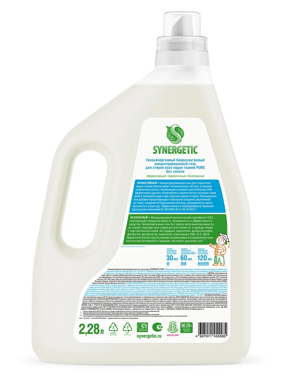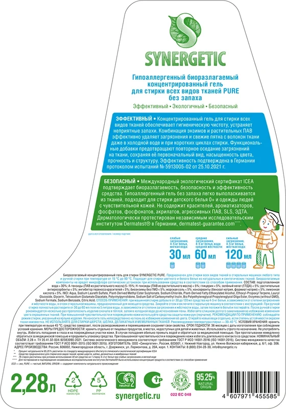 Биоразлагаемый концентрированный гель для стирки всех видов тканей Synergetic Pure обеспечивает гигиеническую чистоту, устраняет неприятные запахи. Предназначен для стирки всех видов тканей в стиральных машинах любого типа и ручной стирки при температуре от 15 C до 90 C. Подходит для стирки цветного и белого белья из натуральных и синтетических тканей. Комбинация энзимов и растительных ПАВ эффективно удаляет загрязнения и свежие пятна с волокон ткани даже в холодной воде и при коротких циклах стирки. Функциональные добавки предотвращают повторное оседание загрязнений на ткани, сохраняя ее первоначальный вид, насыщенность цвета, прочность и структуру. Эффективность подтверждена в Германии. Международный экологический сертификат ICEA подтверждает биоразлагаемость, безопасность и эффективность средства. Гипоаллергенный гель без запаха легко выполаскивается из тканей, подходит для стирки детского белья 0+ и одежды людей с чувствительной кожей. Не содержит красителей, ароматизаторов, фосфатов, фосфонатов, акрилатов, агрессивных ПАВ, SLS, ЭДТА.