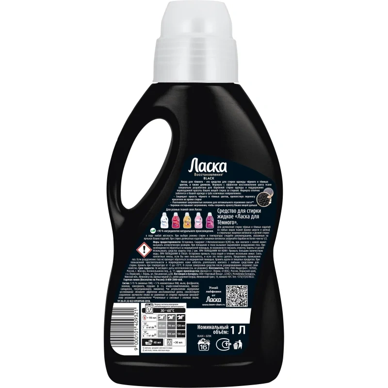 Жидкость для стирки Ласка Восстановление черного 1 л Назначение: гель Ласка для стирки 3D Эффект восстановления Черного. Ласка с «3D Эффектом восстановления черного» — это жидкое средство для стирки одежды черного и темных цветов. Формула 3D ухаживает за тканью, и стирка за стиркой поддерживает красоту цвета в 3 ключевых направлениях: 1. Интенсивность Цвета — Защищает насыщенность черного; 2. Стойкость Цвета — Препятствует переносу красителя во время стирки; 3. Сияние Цвета — Разглаживает шероховатые волокна для оптимального отражения света. Способ применения: при выборе режима стирки и температуры следуйте рекомендациям, указанным на ярлыках Ваших изделий. Рекомендуется использовать режим деликатной стирки. Использовать как основное средство для стирки. Меры предосторожности: беречь от детей. При повышенной чувствительности и повреждениях кожи избегать длительного контакта с любыми средствами для стирки. При ручной стирке используйте средства защиты кожи рук (перчатки). В случае попадания средства в глаза немедленно промыть проточной водой. Хранить вдали от пищевых продуктов. Состав: 5–15% анионные ПАВ, менее 5% неиногенных ПАВ, мыло, фосфонаты, консервант, энзимы, отдушка (в т. ч. амилциннамаль, бутилфенилметилпропиональ, цитроннелон, лимонен). Условия хранения: хранить, защищая от прямых солнечных лучей, при температуре не выше 35°C. Срок годности: 36 месяцев.