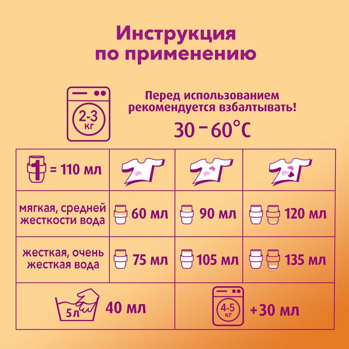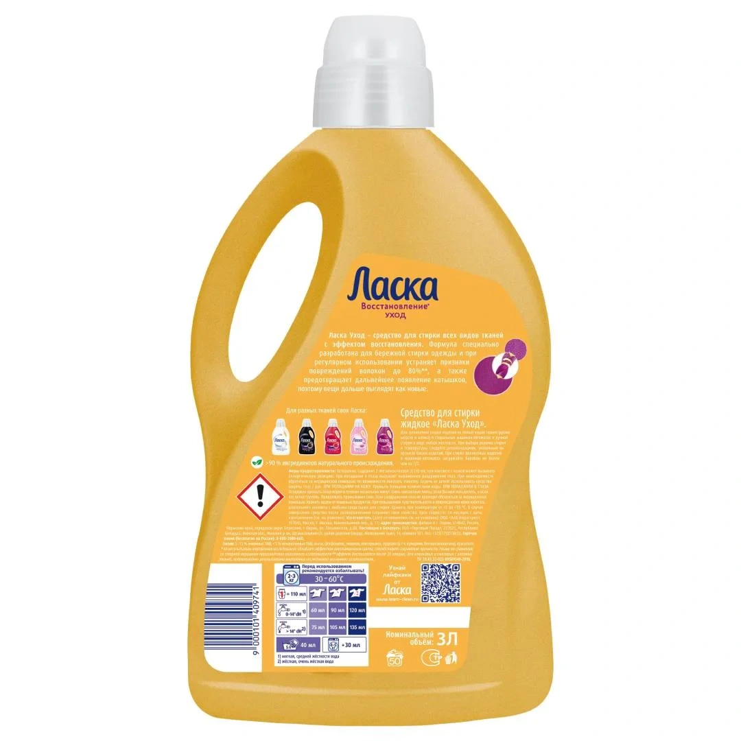 Гель для стирки Ласка Восстановление уход для всех видов ткани. Жидкий порошок Ласка Восстановление уход эффективно и бережно отстирывает загрязнения на одежде и белье. В отличие от обычного стирального порошка, Ласка содержит специальные цветозащитные ингредиенты, которые обеспечивают стойкость цвета вашей одежды. Энзим целлюлаза в составе формулы 'срезает' катышки с поверхности ткани до 80%, что делает поверхность более гладкой. Если цвет одежды с катышками смотрится серым или блёклым, то после их удаления цвет воспринимается более ярким из-за оптимального отражения света ровной поверхности ткани. Преимущества геля для стирки Ласка: бережно и эффективно отстирывает загрязнения; предотвращает и удаляет катышки до 80%; восстанавливает и защищает яркость цвета; не оставляет разводов. Гель Ласка удобен в использовании: дозируйте жидкое средство согласно инструкции, заливайте его в отделение для стирального порошка или добавьте мерный колпачок со средством в барабан стиральной машины.