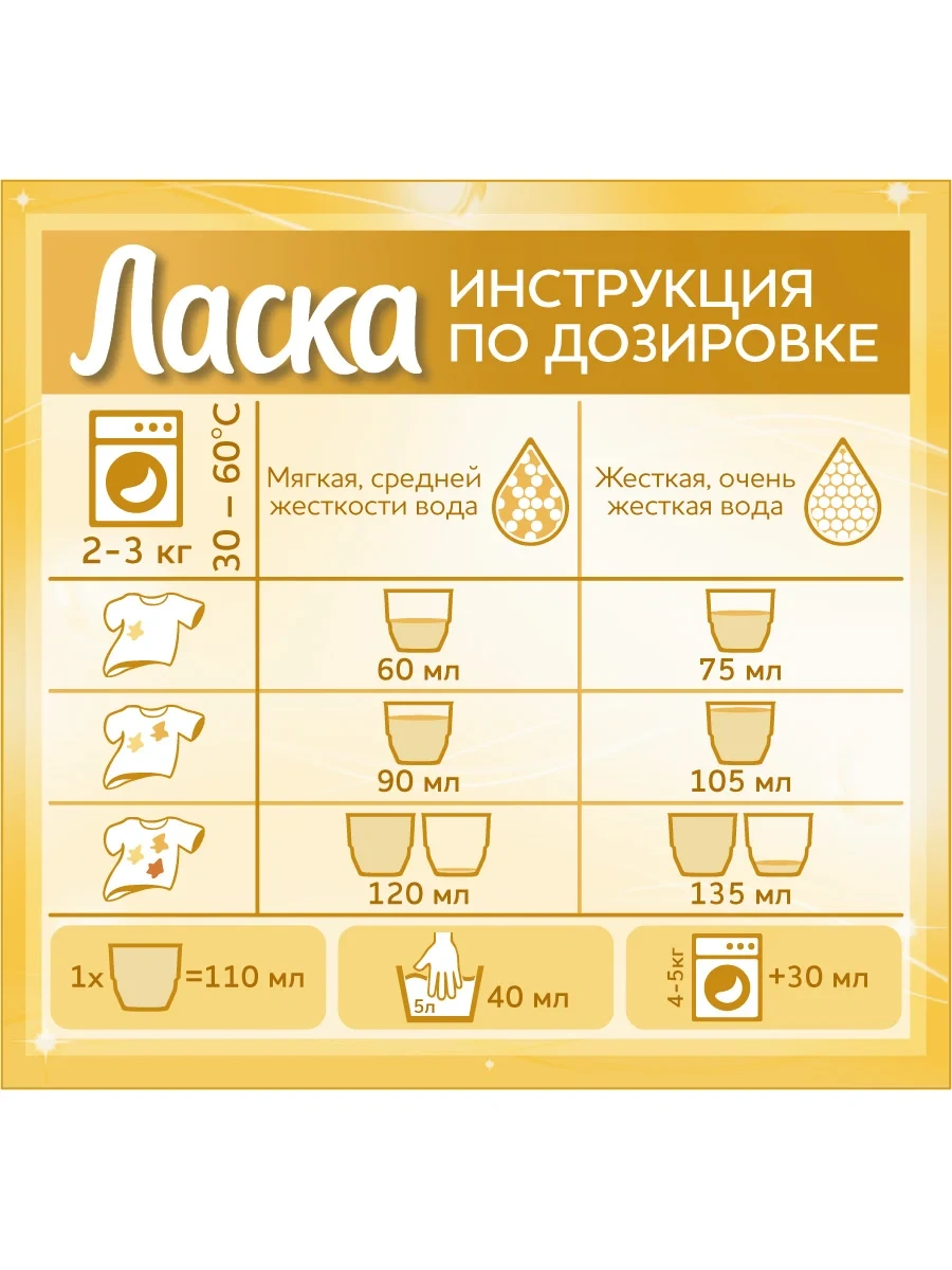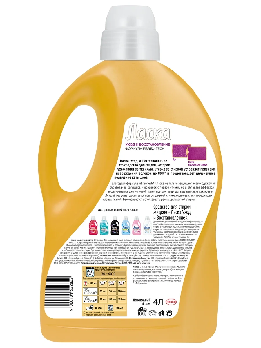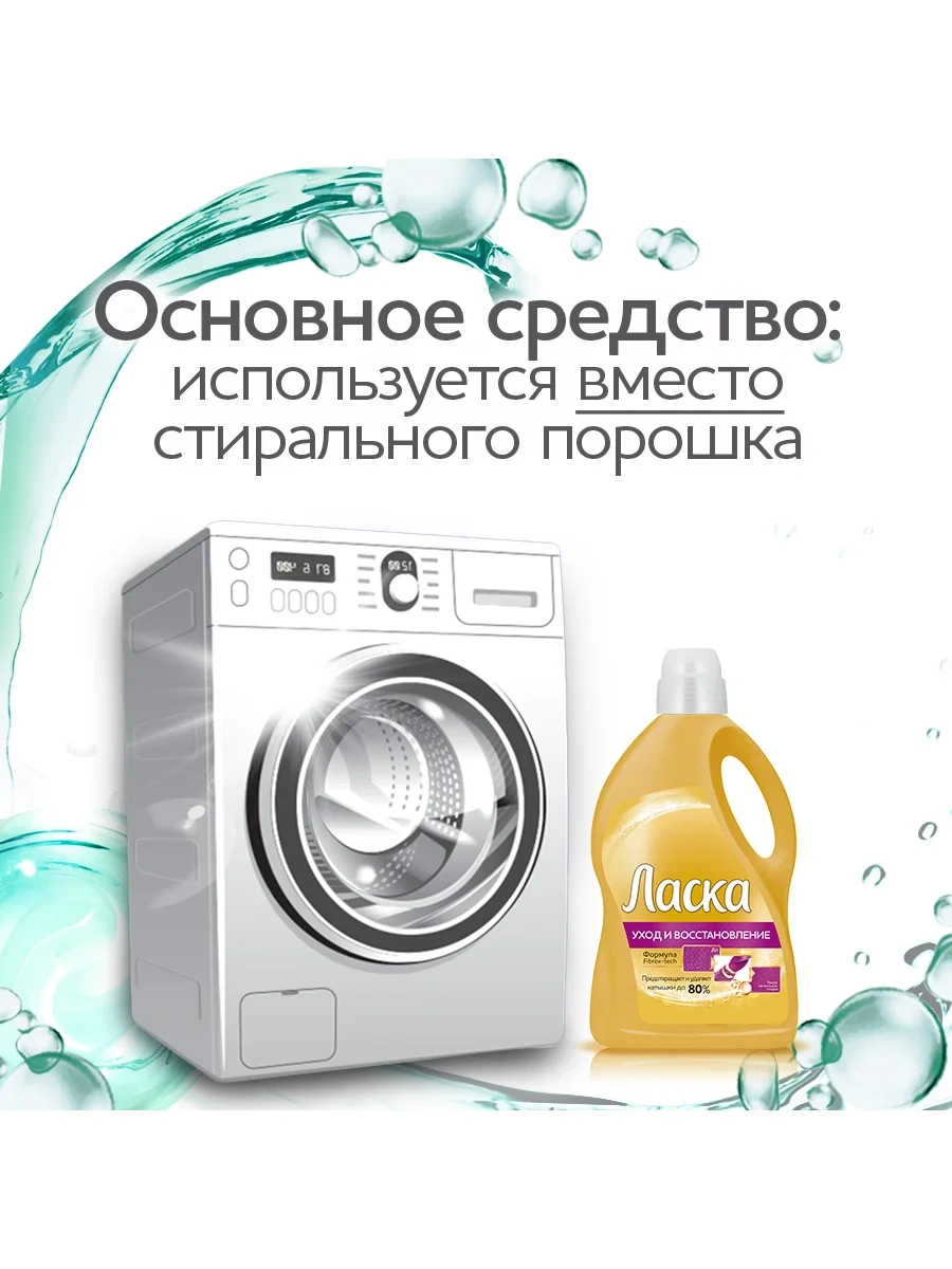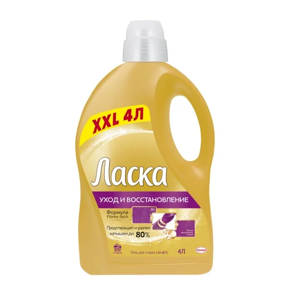Гель для стирки Ласка Восстановление уход для всех видов ткани. Жидкий порошок Ласка Восстановление уход эффективно и бережно отстирывает загрязнения на одежде и белье. В отличие от обычного стирального порошка, Ласка содержит специальные цветозащитные ингредиенты, которые обеспечивают стойкость цвета вашей одежды. Энзим целлюлаза в составе формулы 'срезает' катышки с поверхности ткани до 80%, что делает поверхность более гладкой. Если цвет одежды с катышками смотрится серым или блёклым, то после их удаления цвет воспринимается более ярким из-за оптимального отражения света ровной поверхности ткани. Преимущества геля для стирки Ласка: бережно и эффективно отстирывает загрязнения; предотвращает и удаляет катышки до 80%; восстанавливает и защищает яркость цвета; не оставляет разводов. Гель Ласка удобен в использовании: дозируйте жидкое средство согласно инструкции, заливайте его в отделение для стирального порошка или добавьте мерный колпачок со средством в барабан стиральной машины.