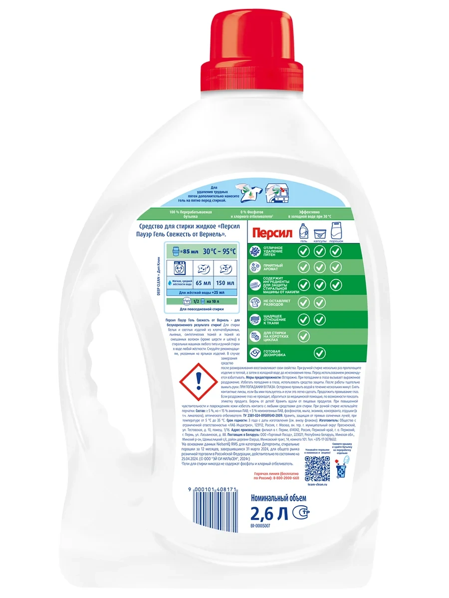 Гель для стирки Персил Свежесть от Вернель: сохраняет первозданную чистоту и яркость белых вещей; глубоко проникает в волокна ткани и отстирывает даже самые сложные пятна; дарит вещам свежий аромат от Вернель, который сохраняется надолго; подходит для всех типов тканей, кроме шерсти и шелка; обеспечивают щадящее отношение к ткани во время стирки; растворяется даже в холодной воде и при стирке на коротких циклах; не оставляет разводов и полностью выполаскивается водой; не пылит, не просыпается и не накапливается в кювете стиральной машины.