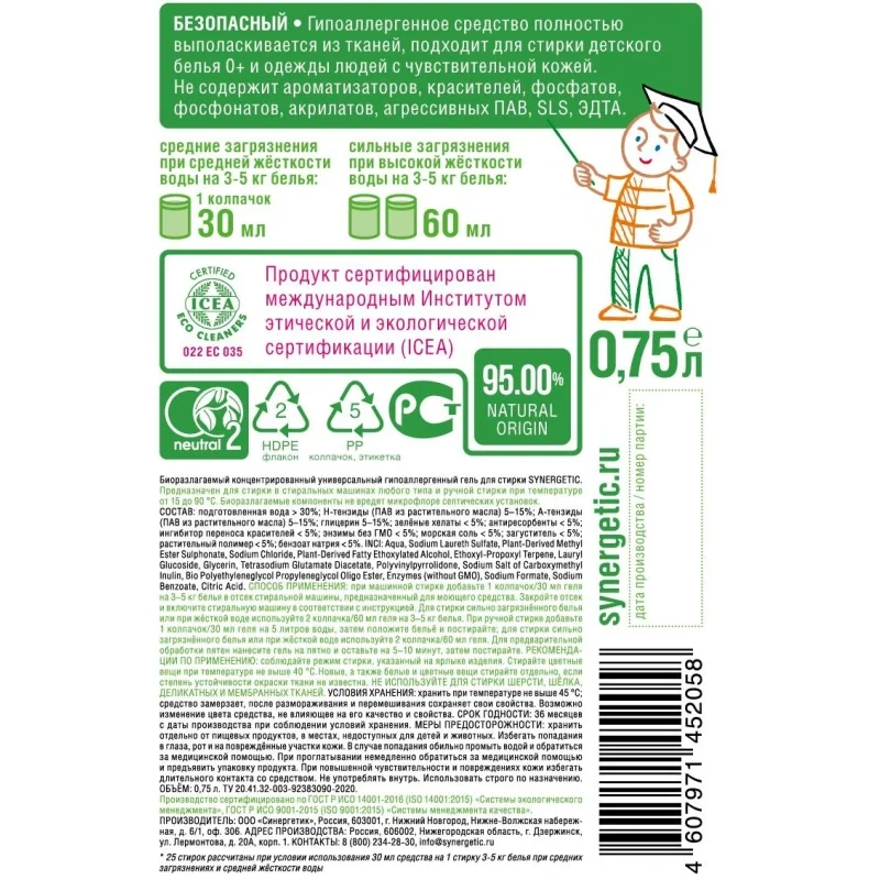 Гель для стирки Synergetic универсальный 2в1 750 мл Назначение: концентрированный гипоаллергенный гель для стирки '2в1' с пятновыводителем предназначен для машинной и ручной стирки при температуре от 15С до 90С. Комбинация пяти видов энзимов и растительных ПАВ позволяет эффективно удалять загрязнения и свежие пятна с волокон ткани даже в холодной воде и при коротких циклах стирки. Эффективность подтверждена в Германии. Гель универсален: он подходит для цветного и белого белья из натуральных и синтетических тканей, одежды детей и людей с чувствительной кожей. Средство полностью выполаскивается из тканей, не содержит ароматизаторы, красители, фосфаты, фосфонаты, акрилаты, агрессивные ПАВ, SLS, ЭДТА. Гель для стирки Synergetic - безопасный для окружающей среды и биоразлагаемый: под воздействием природных факторов он распадается на безвредные для природы вещества. Флакон выполнен из полиэтилена и имеет код переработки '02 HDPE'. Код переработки крышки - '05 PP'. Рекомендуем сортировать пустую тару и сдавать ее на переработку в проект SYNERGETIC 'ЭкоМобиль'. Способ применения: При машинной стирке добавьте 1 колпачок / 30 мл геля на 5 кг белья в отсек стиральной машины, предназначенный для моющего средства. Закройте отсек и включите стиральную машину в соответствии с инструкцией. Для стирки сильно загрязненного белья или при жесткой воде используйте 2 колпачка / 60 мл геля. При ручной стирке добавьте 1 колпачок / 30 мл геля на 5 литров воды, затем положите белье; для стирки сильно загрязненного белья или при жесткой воде используйте 2 колпачка / 60 мл геля. Для предварительной обработки пятен нанесите гель на пятно и оставьте на 5-10 минут, затем постирайте в обычном режиме. Рекомендации по применению: соблюдайте режим стирки, указанный на ярлыке изделия. Не стирать цветные вещи при температуре выше 40С. Не использовать для стирки шерсти, шелка, деликатных и мембранных тканей. Рекомендуемая температура стирки 30С - 40С. Меры предосторожности: хранить отдельно от пищевых продуктов, в местах, недоступных для детейи животных. Избегать попадания в глаза, рот и на поврежденные участки кожи. В случае попадания обильно промыть водой и обратиться за медицинской помощью. При проглатывании немедленно обратиться за медицинкой помощью и предъявить упаковку продукта. При повышенной чувствительности и повреждениях кожи избегать длительного контакта со средством. Не употреблять внутрь. Использовать строго по назначению. Состав: вода подготовленная > 30%; Н-тензиды (ПАВ из растительного масла): этоксилированный жирный спирт из пальмоядрового масла, этоксилированный терпен, алкилполигликозид 5-15%; А-тензиды (ПАВ из растительного масла): метилэфир сульфонат натрия, лауретсульфат натрия 5-15%; глицерин 5-15%; зеленые хелаты (МГДА, ГЛДА) < 5%; антиресорбенты - карбоксиметилинулин < 5%; ингибитор переноса красителей - винилпирролидон < 5%; энзимы без ГМО (смесь протеазы, амилазы, целлюлазы, липазы, маннаназы) < 5%; морская соль < 5%; загуститель - гидроксиэтилцеллюлоза < 5%; функциональная добавка - растительный полимер < 5%; консервант - бензоат натрия < 5%. Условия хранения: хранить при температуре не выше 45C; средство замерзает, после размораживания и перемешивания сохраняет свои свойства. Срок годности: 36 месяцев с даты производства при соблюдении условий хранения.
