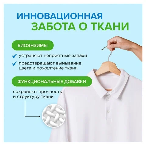 Функциональные добавки предотвращают окрашивание ткани, сохраняя ее первоначальный вид, насыщенность цвета, прочность и структуру. Гипоаллергенная отдушка на основе эфирных масел лаванды и литсеи оставляет легкий и приятный аромат.