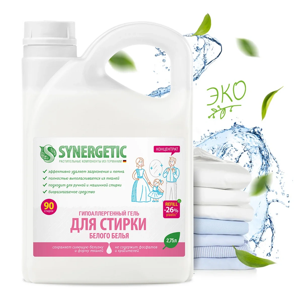 Гель для стирки Synergetic, для белого белья, канистра, 2,75л