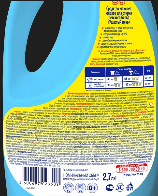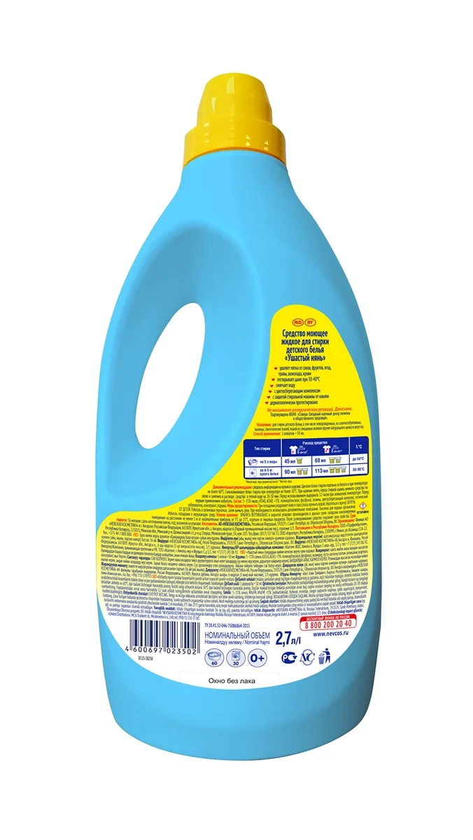 Средство гипоаллергенно, подтверждено ФБУН Северо-Западный научный центр гигиены и общественного здоровья. Золотой диплом конкурса Отметка родителей 2017. Эффективно удаляет специфические детские пятна и загрязнения уже при 30-40С. Быстро растворяется в воде и полностью выполаскивается. Для стирки белых и цветных вещей. Благодаря двойным стенкам колпачка, после дозировки средство стекает внутрь флакона, оставляя флакон чистым и сухим. Отстирывает основные виды загрязнений и значительно превосходит аналоги (производства Германия и Россия). Более удобная форма и консистенция для использования - не пылит, удобно дозируется. 0% красителей, хлора, фосфатов и агрессивных отдушек. Для стирки детского белья, в том числе новорожденных, из хлопчатобумажных, льняных, синтетических тканей, а также тканей из смешанных волокон (кроме изделий из натурального шелка и шерсти) в автоматических стиральных машинах, машинах активаторного типа и вручную.