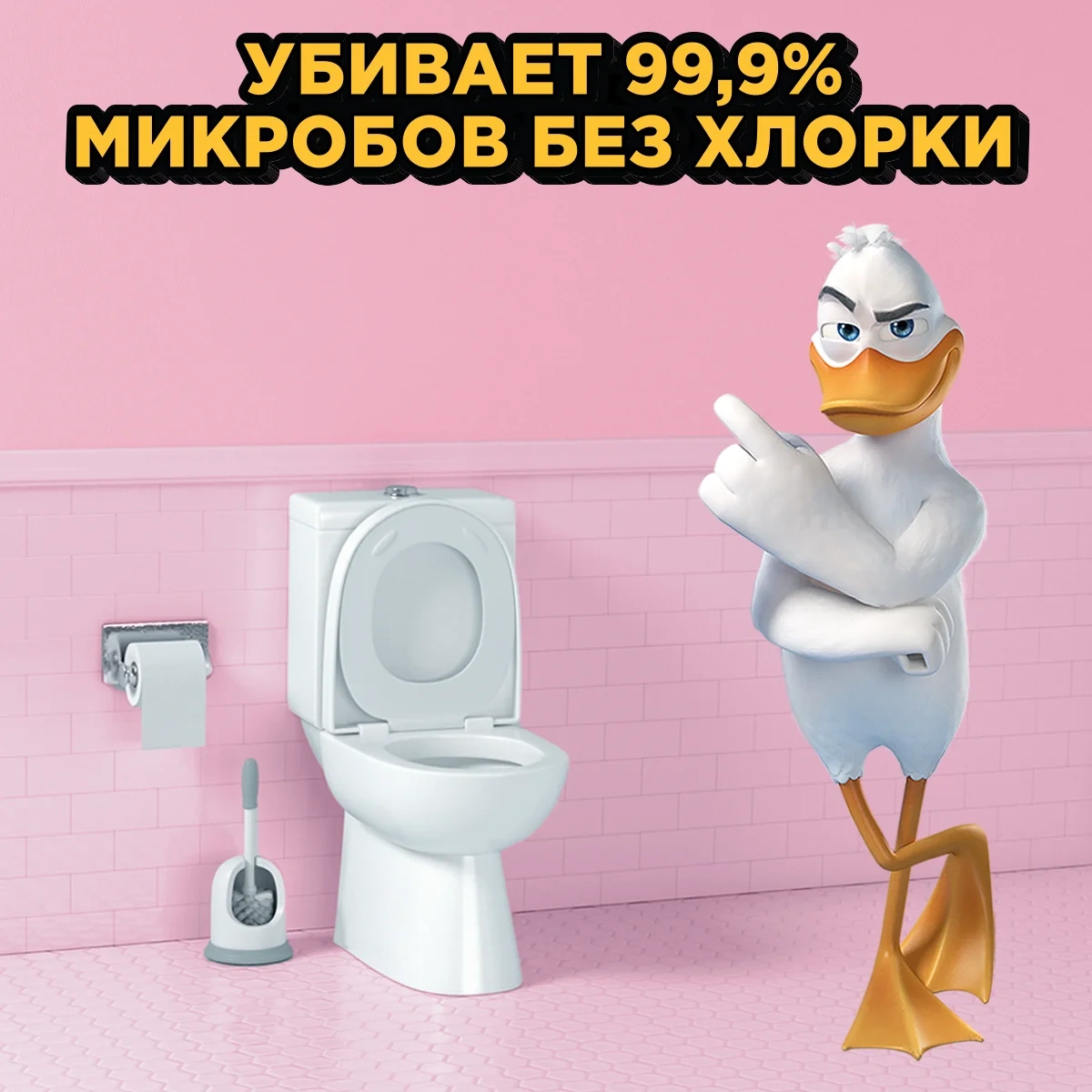 Уникальная форма горлышка позволяет гелю лучше попадать в труднодоступные места скопления бактерий под ободком унитаза. Обладает дезинфицирующим эффектом - убивает 99,99% вирусов и бактерий. Устраняет неприятные запахи.
