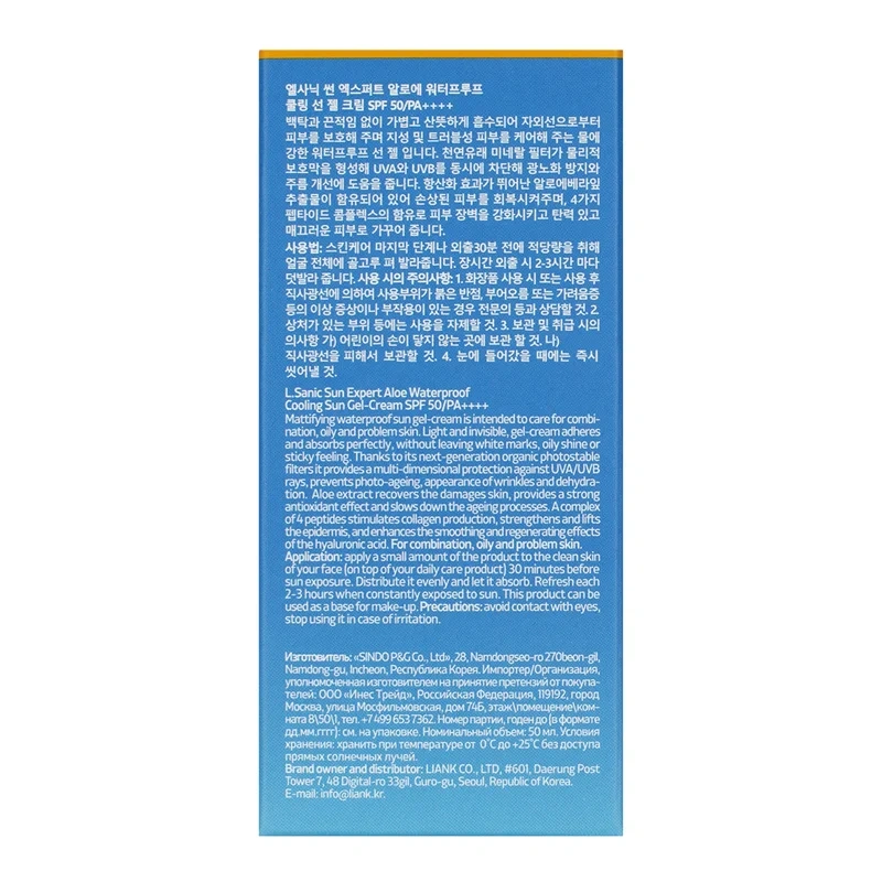 Гель-крем для лица L.Sanic солнцезащитный водостойкий с алоэ SPF50, 50мл