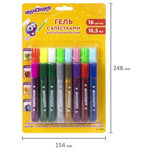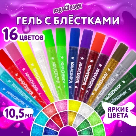 Гель с блестками ЮНЛАНДИЯ, 16 цветов ассорти по 10,5 мл, блистер, 662255