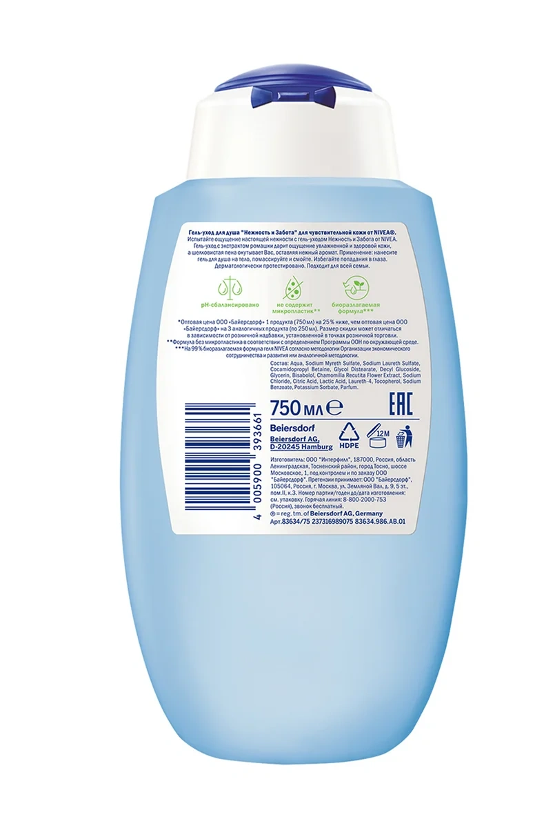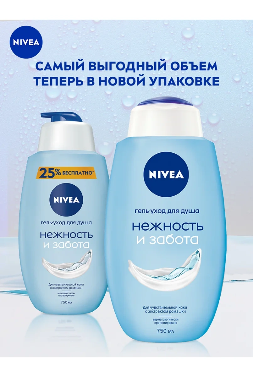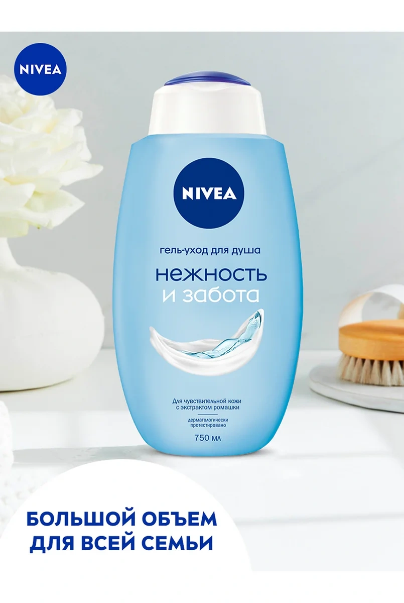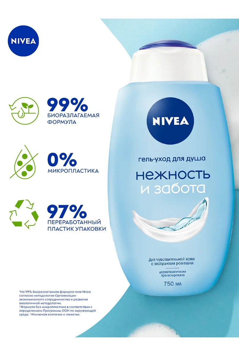 Испытайте ощущение настоящей нежности! Гель-уход для душа Нежность и забота от Nivea с экстрактом ромашки мягко и деликатно очищает кожу, сохраняя естественный pH баланс, защищая кожу от пересушивания. Подходит для чувствительной кожи и ежедневного применения. Мягкое очищение и нейтральный аромат подходит для использования всей семьей. Обновленная биоразлагаемая формула не содержит микропластик, потому что мы заботимся не только о красоте и здоровье кожи, но и об окружающей среде! Мы хотим менять мир к лучшему и ставим перед собой амбициозные цели в сфере защиты окружающей среды. Исследователи Nivea постоянно совершенствуют формулы, чтобы сделать наши средства максимально подходящими для кожи, одновременно минимизируя уровень их воздействия на природу.