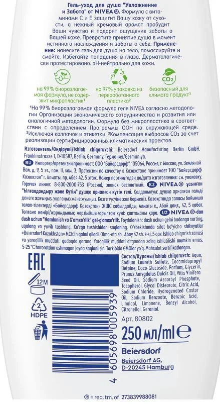 Бережно ухаживает за вашим телом каждый день. Кожа становится нежной и эластичной - вот результат ежедневного использования геля. Обогащённый маслом миндаля, гель мягко очищает Вашу кожу и ухаживает за ней, делая её гладкой и шелковистой. Сбалансированный pH предотвращает пересушивание кожи, поддерживая ее естественный уровень увлажненности. А мягкий нейтральный аромат подойдет для всей семьи. Обновленная биоразлагаемая формула не содержит микропластик.