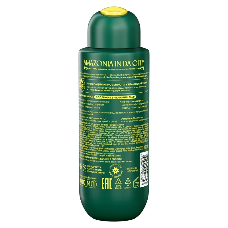 Натуральный гель для душа увлажняющий с экстрактом лайма Solzao Amazonia In Da City, 400мл. Дикие леса Амазонии пахнут тайной и свежестью цитруса. Инновационная технология мгновенного увлажнения кожи Hydratica. Улучшает транспортировку воды, помогая коже впитывать в 2 раза больше влаги и удерживать ее. Экстракт лайма содержит витамины С и Р.