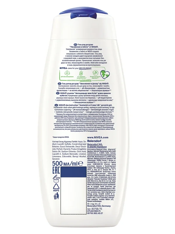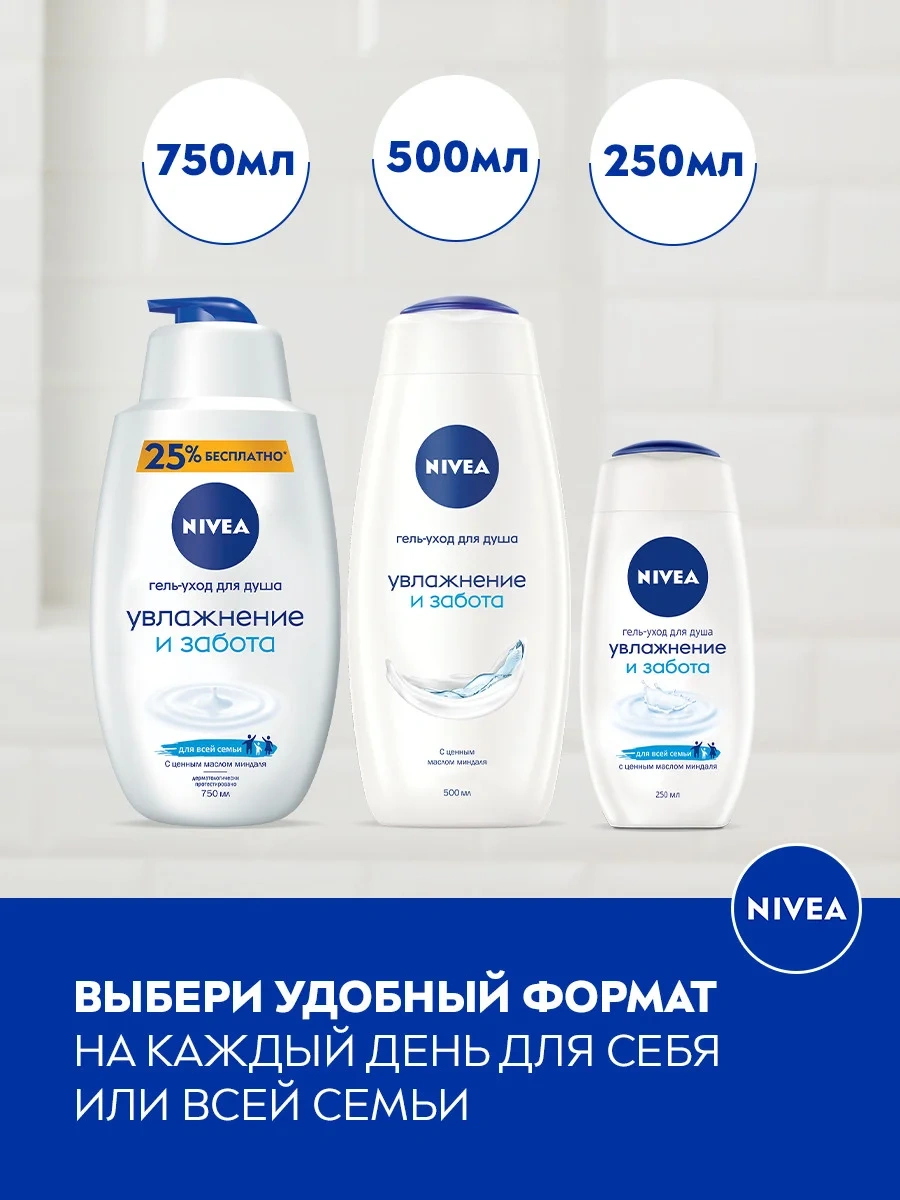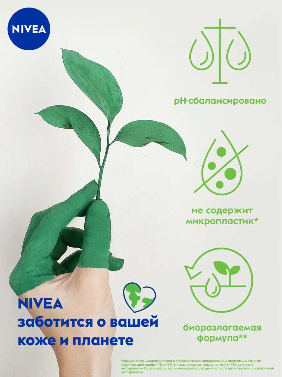 Приятно, когда под рукой есть средство, которое очищает кожу и одновременно питает ее. Гель-уход для душа Nivea Увлажнение и забота бережно ухаживает за твоим телом каждый день. Кожа становится нежной и эластичной - вот результат ежедневного использования геля Увлажнение и забота от Nivea. Обогащённый маслом миндаля, гель мягко очищает Вашу кожу и ухаживает за ней, делая её гладкой и шелковистой. Сбалансированный pH предотвращает пересушивание кожи, поддерживая ее естественный уровень увлажненности. А мягкий нейтральный аромат подойдет для всей семьи. Обновленная биоразлагаемая формула не содержит микропластик, потому что мы заботимся не только о красоте и здоровье кожи, но и об окружающей среде! Мы хотим менять мир к лучшему и ставим перед собой амбициозные цели в сфере защиты окружающей среды. Исследователи Nivea постоянно совершенствуют формулы, чтобы сделать наши средства максимально подходящими для кожи, одновременно минимизируя уровень их воздействия на природу.