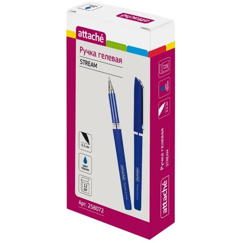 Гелевая ручка Attache Stream с корпусом из материала, стилизованного под нубук. Металлизированный наконечник ручки, металлический клип для крепления к одежде. Ручка гелевая с чернилами синего цвета, толщина линии — 0,5 мм. Ручка гелевая обеспечивает легкое и мягкое письмо, яркие и насыщенные линии. Чернила гелевой ручки быстро высыхают, не размазываются. Длина стержня 124 мм.