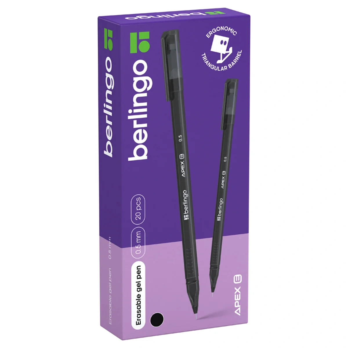 Одноразовая стираемая гелевая чёрная ручка с колпачком с пластиковым клипом Berlingo Apex E - это удобная трёхгранная форма и качество чернил. Цвет чернил - чёрный. Диаметр пишущего узла составляет 0,5 мм, благодаря чему получается тонкая, аккуратная линия. Толщина линии письма составляет 0,3 мм, длина непрерывной линии - свыше 350 метров. Рифление в зоне захвата препятствует скольжению пальцев при письме. Тонированный корпус позволяет контролировать расход чернил. Цвет корпуса соответствует цвету чернил. Качественные гелевые чернила обеспечивают чистое и чёткое письмо. Термочувствительные чернила становятся невидимыми при нагревании до 60°С и выше. Нагрев достигается трением встроенным в торцевой элемент ластиком. Обесцвеченные чернила проявляются при температуре ниже -18°С . Возможность многократного стирания и написания текста. Количество циклов написания/стирания ограничено износостойкостью бумаги. Набор из 20 ручек упакован в картонную коробку.