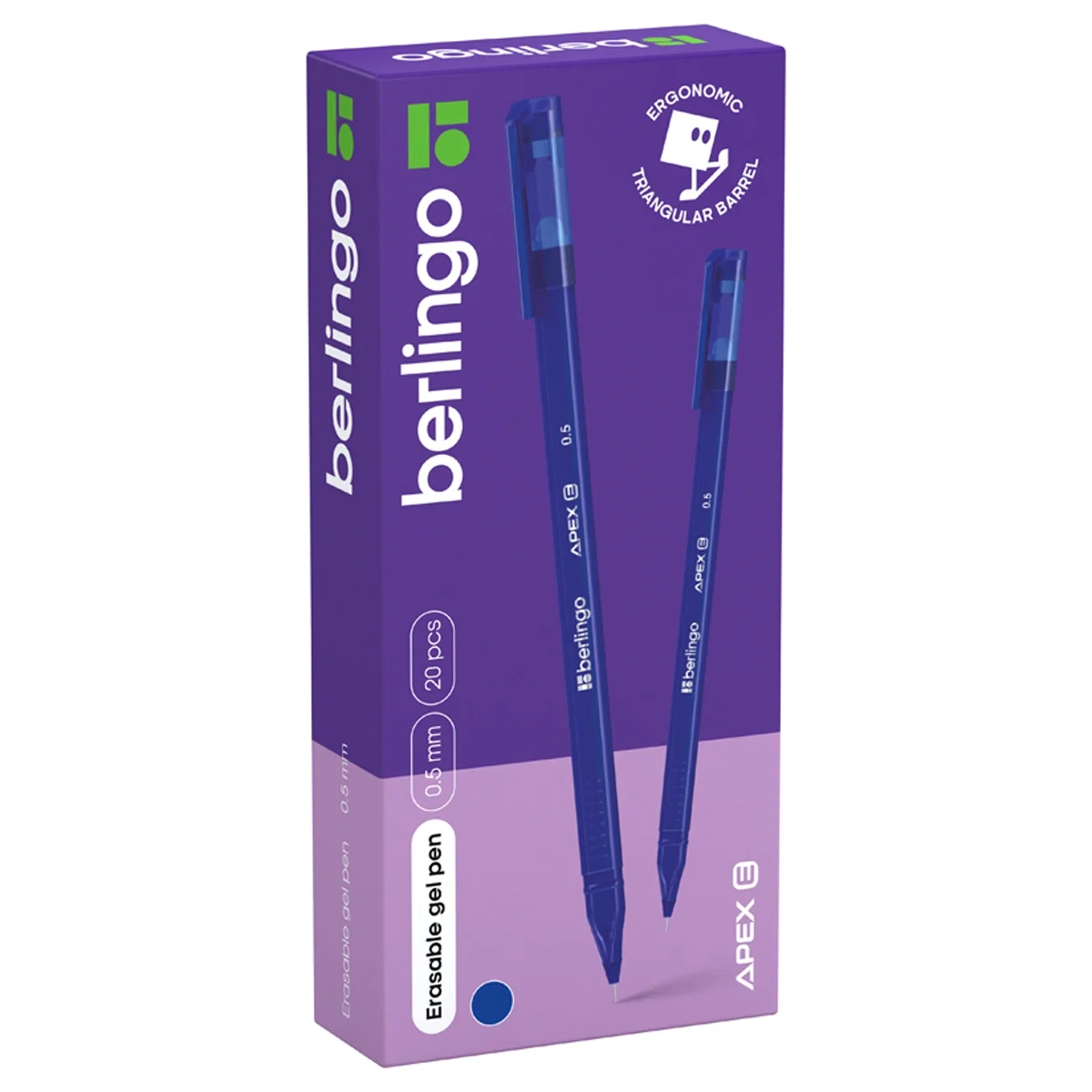 Одноразовая стираемая гелевая ручка Berlingo Apex E с колпачком с пластиковым клипом. Удобная трёхгранная форма. Рифление в зоне захвата препятствует скольжению пальцев при письме. Тонированный корпус позволяет контролировать расход чернил. Цвет корпуса соответствует цвету чернил. Качественные гелевые чернила обеспечивают чистое и чёткое письмо. Диаметр пишущего узла - 0,5 мм. Термочувствительные чернила становятся невидимыми при нагревании до 60°С и выше. Нагрев достигается трением встроенным в торцевой элемент ластиком. Обесцвеченные чернила проявляются при температуре ниже -18°С . Возможность многократного стирания и написания текста. Количество циклов написания/стирания ограничено износостойкостью бумаги. Диаметр пишущего узла составляет 0,5 мм, благодаря чему получается тонкая, аккуратная линия. Толщина линии письма составляет 0,3 мм, длина непрерывной линии - свыше 350 метров.