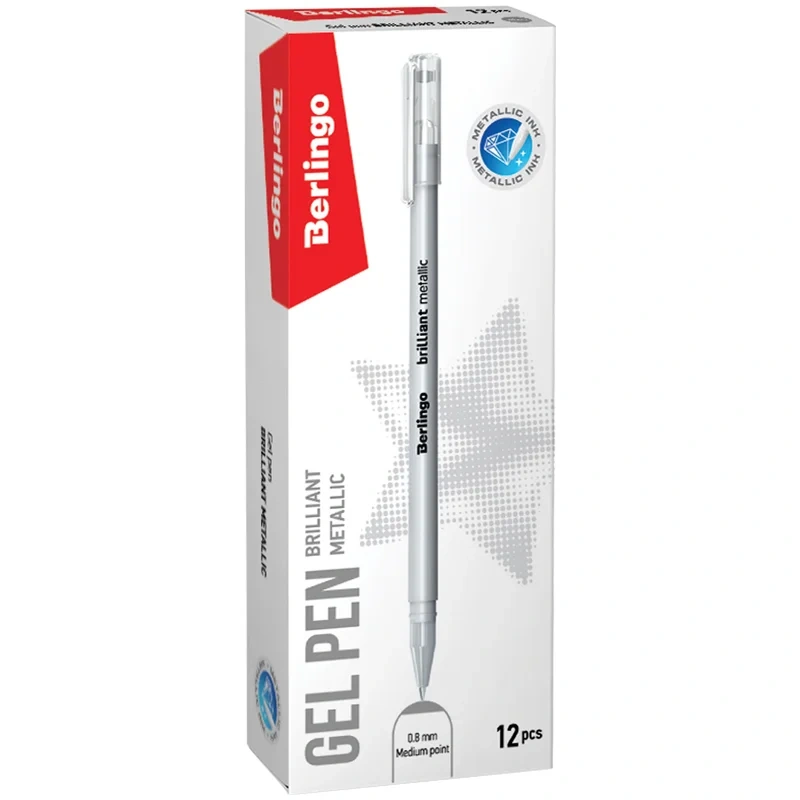 Ручка гелевая Berlingo Brilliant Metallic c серебряным цветом чернил и эффектом металлик будет по душе тем, кто ценит всё неординарное. Ручка изготовлена с использованием корейских чернил, которые обеспечивают высокое качество письма и срок годности 2 года. Бархатистое покрытие soft-touch создаёт дополнительный комфорт при использовании. Цвет корпуса соответствует цвету чернил. Расширяя возможности для воплощения творческих задумок, производитель сделал ручку, подходящей для рисования и письма на чёрной бумаге. Диаметр пишущего узла 0,8 мм обеспечивает мягкость письма и насыщенность цвета.• Цвет чернил: серебряный с эффектом металлик;• Толщина линии письма: 0,6 мм;• Длина письма: 450 м;• Цвет корпуса: серебряный.