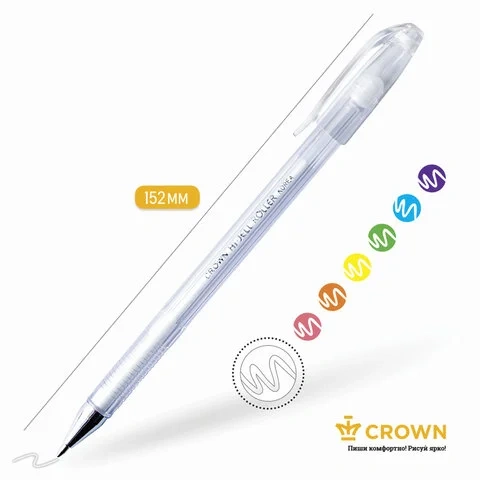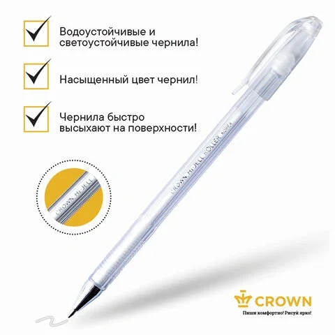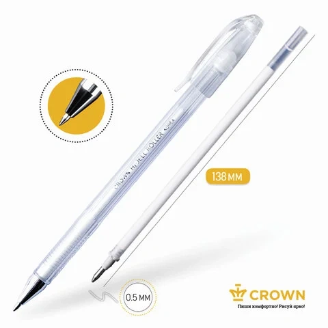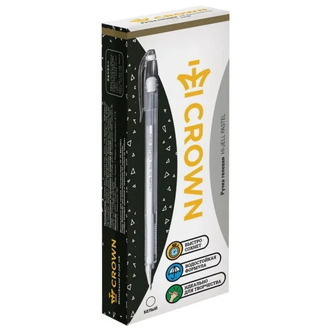 Гелевая белая ручка Crown Hi-Jell Pastel – надежная ручка для воплощения всех художественных идей. Диаметр пишущего узла - 0,8 мм, благодаря чему получается насыщенная линия. В упаковке 12 штук. Она идеально подойдет для скрапбукинга, леттеринга или рисования. Корпус сделан из высококачественного пластика, который при поломке не оставляет мелких осколков. Корейские гелевые чернила на водной основе обладают высокой светостойкостью и водостойкостью, мгновенно высыхают, не смазываются. Благодаря гелеобразным чернилам и специальной технологии пишущего узла гелевые ручки Crown Hi-Jell Pastel обеспечивают мягкое и комфортное письмо. Равномерно измельченный пигмент в составе чернил позволяет писать ярко без пропусков и исключает царапины на бумаге.