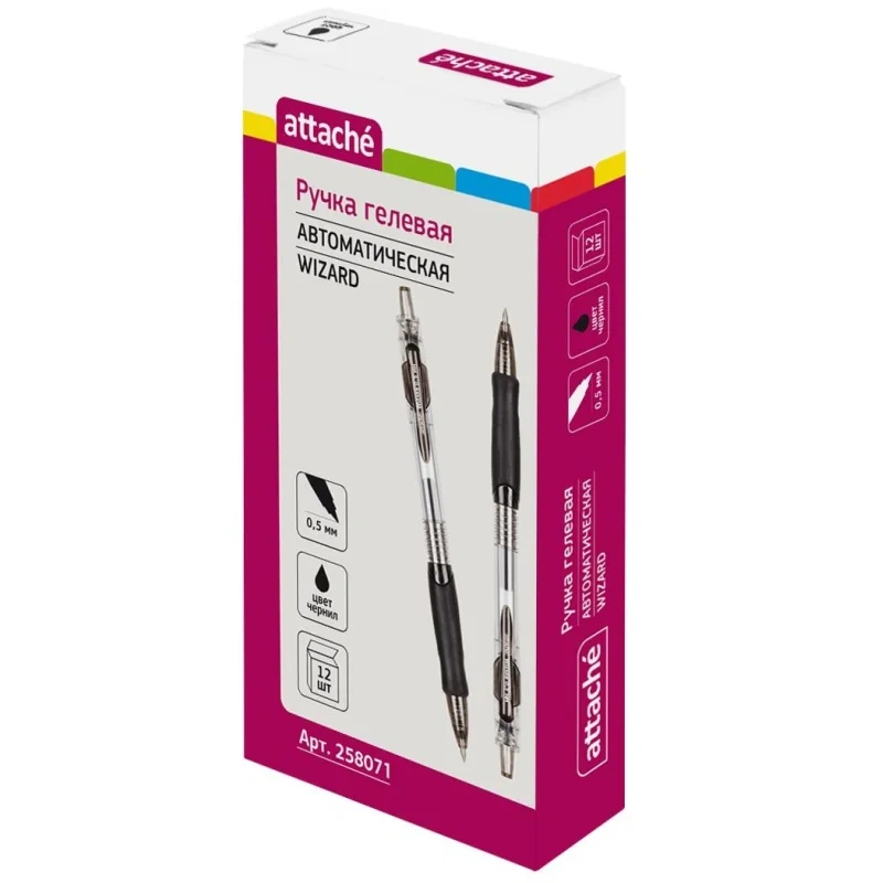 Ручка гелевая автоматическая Attache Wizard изготовлена из качественного пластика. Ручка обеспечивает легкое и мягкое письмо. Чернила быстро высыхают, не размазываются. Эргономичная резиновая манжетка снижает напряжение руки во время работы. Ручка имеет круглый корпус прозрачного цвета. Детали ручки черного цвета соответствуют цвету чернил. Сменный стержень длиной 110 мм. Диаметр пишущего узла, равный 1 мм, создает линию письма, равную 0,5 мм. Цвет чернил: черный. Имеет стандартный наконечник. Особый акцент этой ручке придает лаконичный дизайн.