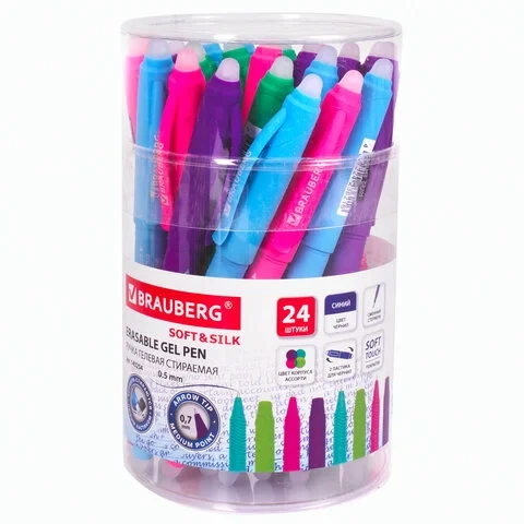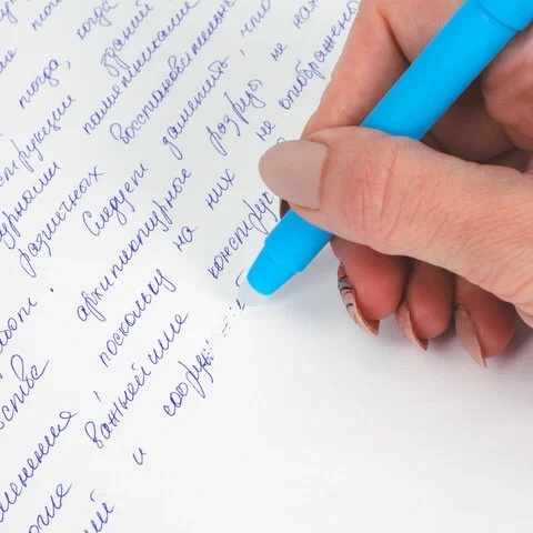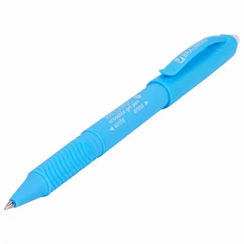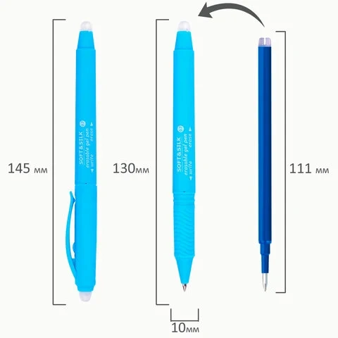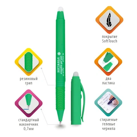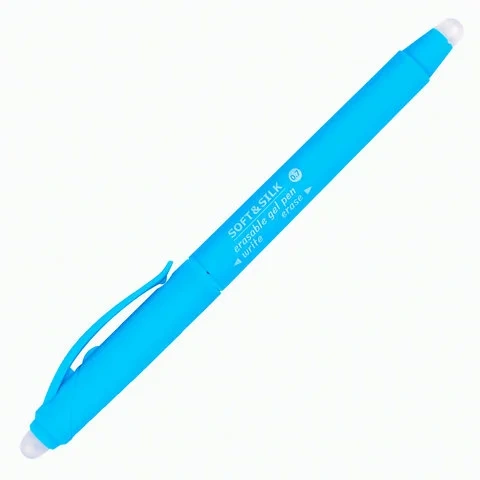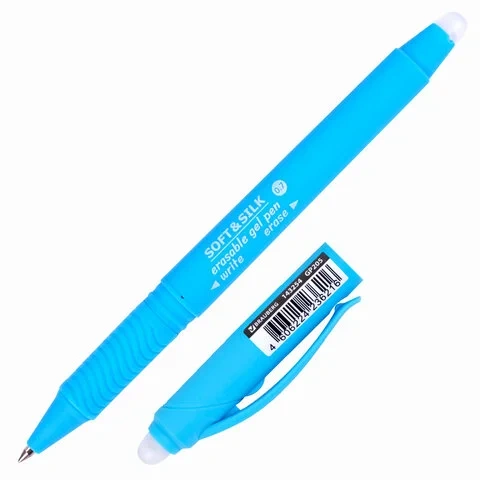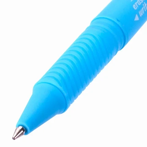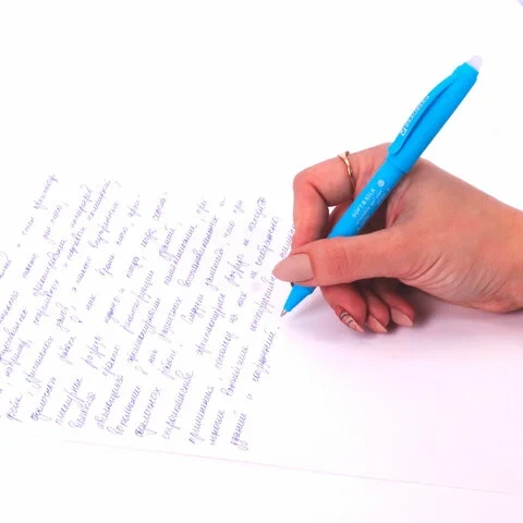 Ручка пишет специальными гелевыми чернилами синего цвета. Снабжена двумя ластиками для удаления надписей: на колпачке и на корпусе ручки. При письме и стирании ручка не повреждает бумагу, делая исправления незаметными. Диаметр пишущего узла 0,7 мм создает тонкую линию письма, равную 0,5 мм. Прорезиненный корпус для комфортного и длительного использования.