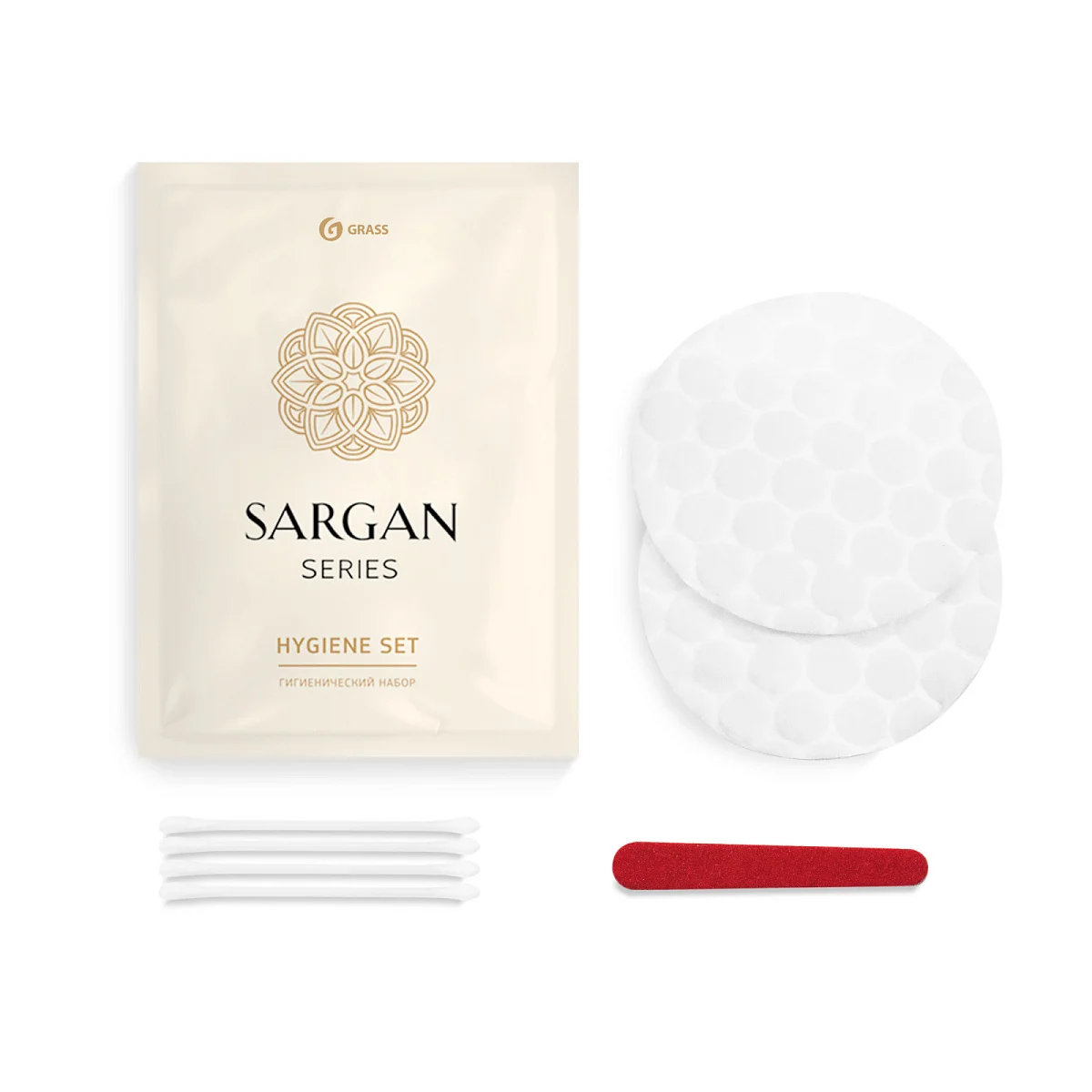 Набор косметический Grass Sargan флоупак (ватные диски — 2 штуки, ватные палочки — 3 штуки, пилка, 300 штук в упаковке)