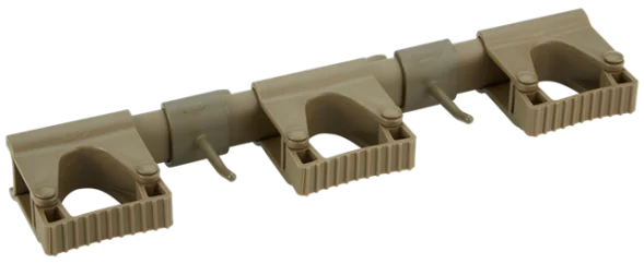Гигиеничное модульное настенное крепление – это удобный способ хранения уборочного инвентаря и инструментов в любом месте предприятия. Рейка-рельс надевается слева или справа на 4 стенных дюбеля. После этого зажимы и крюки защелкиваются на рейке и удерживаются на месте благодаря специальным «насечкам» на ней. Это не позволяет отдельным частям ездить из стороны в сторону. На рейку можно поместить от 1 до 10 модулей. (макс. 5 зажимов или 10 крюков). Зажим способен удерживать инструменты диаметром 28-33 мм. На крюк можно повесить предметы весом до 3 кг. В комплект входят 3 зажима и 2 крюка. Модули и рейку легко разбирать для очистки и замены.