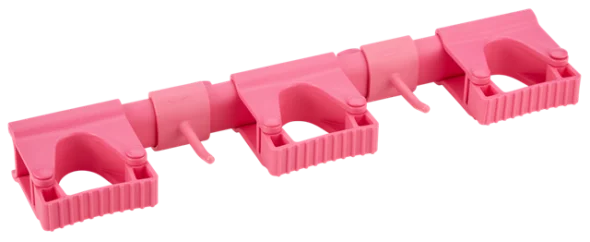 Гигиеничное модульное настенное крепление – это удобный способ хранения уборочного инвентаря и инструментов в любом месте предприятия. Рейка-рельс надевается слева или справа на 4 стенных дюбеля. После этого зажимы и крюки защелкиваются на рейке и удерживаются на месте благодаря специальным «насечкам» на ней. Это не позволяет отдельным частям ездить из стороны в сторону. На рейку можно поместить от 1 до 10 модулей. (макс. 5 зажимов или 10 крюков). Зажим способен удерживать инструменты диаметром 28-33 мм. На крюк можно повесить предметы весом до 3 кг. В комплект входят 3 зажима и 2 крюка. Модули и рейку легко разбирать для очистки и замены.