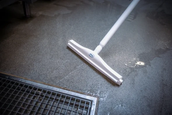 Этот сгон с двойной пластиной из литой резины удаляет воду со всех типов покрытий полов: кафельных, наливных, эпоксидных, цементных.