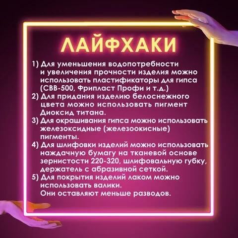 Высокопрочный скульптурный гипс не содержит примесей, обладает высокой природной белизной, равномерно и безусадочно застывает после заливки форм. Гипс обладает рядом достоинств, которые позволяют ему значительно превосходить подавляющее большинство прочих материалов, применяемых в творчестве, а также других сферах. К неоспоримым его преимуществам можно отнести: