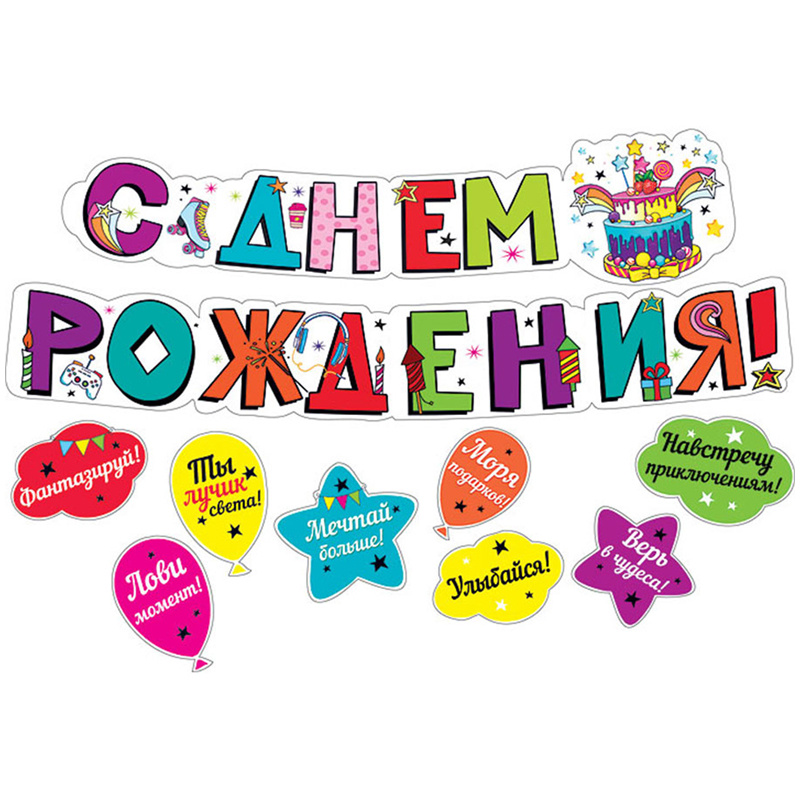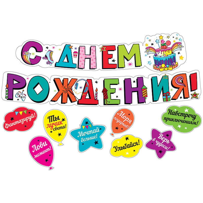 Праздничная гирлянда в виде букв 'С днем рождения' и дополнительными украшениями на скотче (8 предметов). Прекрасное украшение для помещения, в котором проходит чествование именинника. Яркая гирлянда понравится всем гостям и хорошо впишется в праздничный интерьер. Гирлянда без отделки, с пикколо.