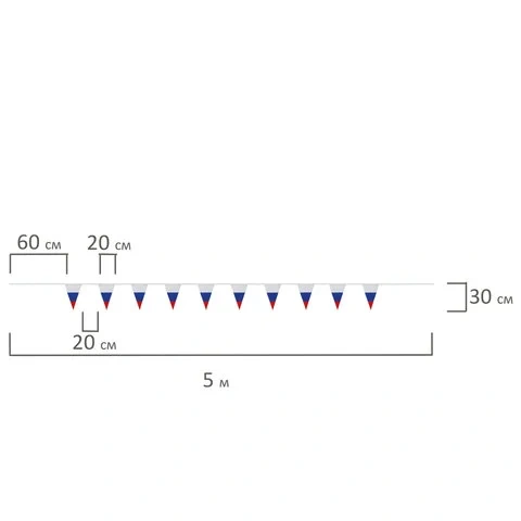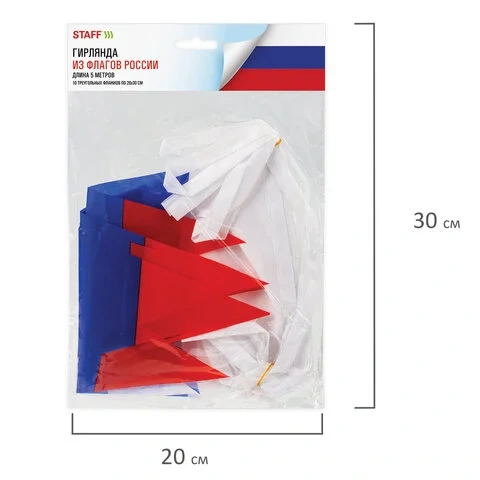 Гирлянда состоит из 10 треугольных флажков на ленте, которые выполнены из полиэфирного шелка, в цветах флага Российской Федерации. Размер флажка - 20х30 см, длина гирлянды - 5 м. Поставляется в пакете с европодвесом.